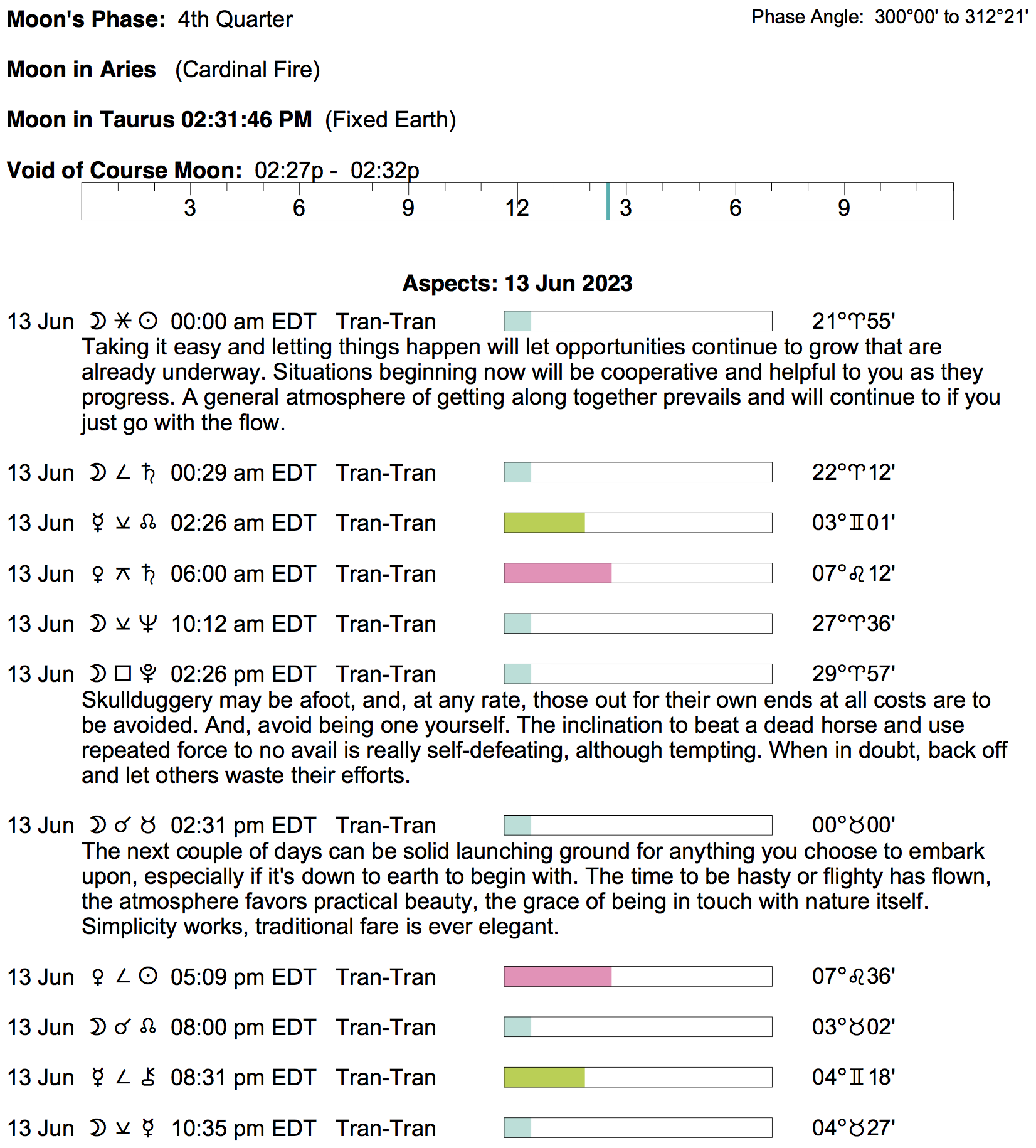 Planet Color Key: The longer the bar, the slower the aspecting planet, and the longer the duration of the planet’s transit.