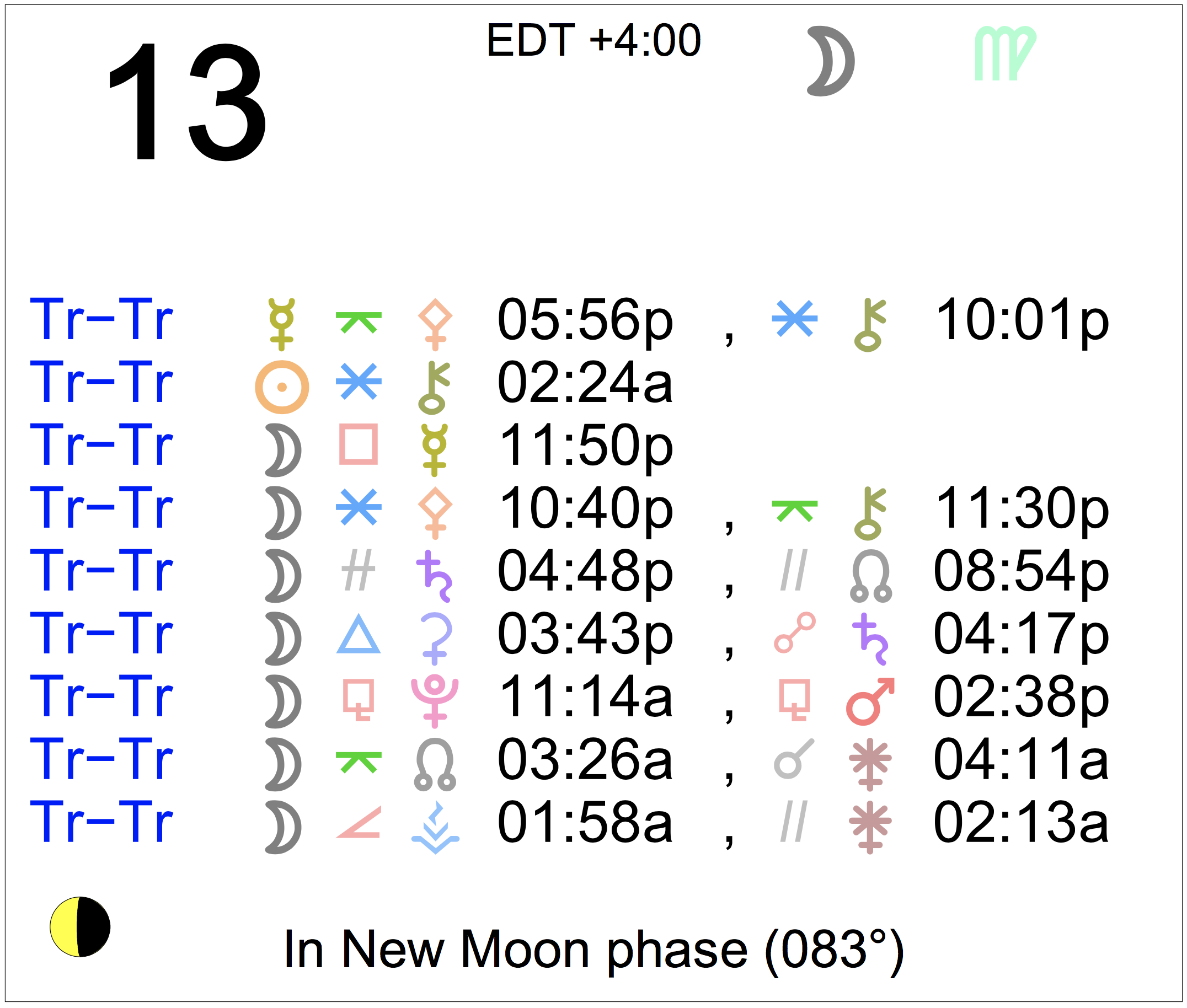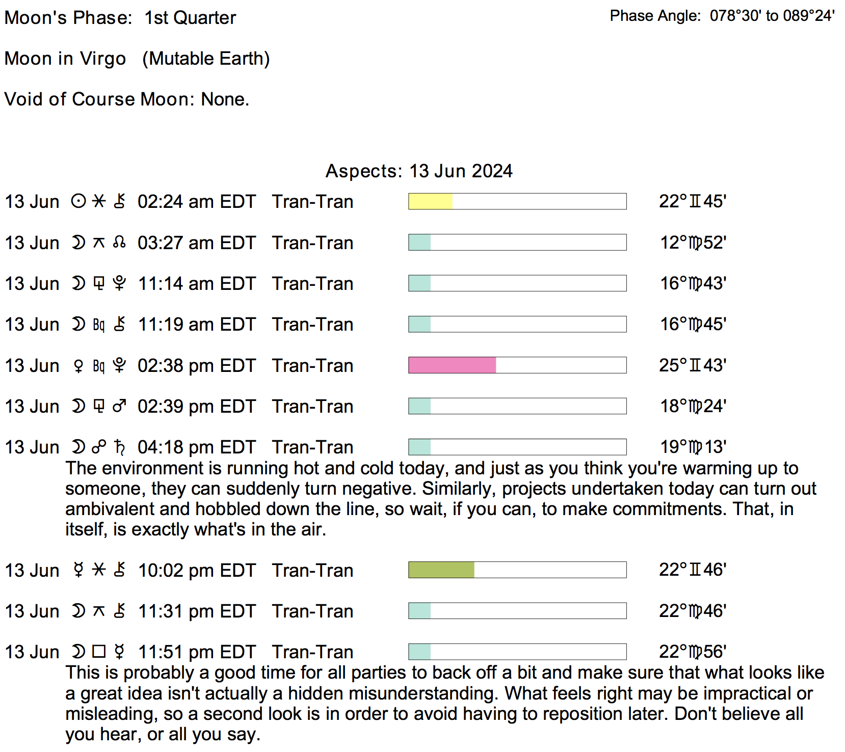Planet Color Key: The longer the bar, the slower the aspecting planet, and the longer the duration of the planet’s transit.