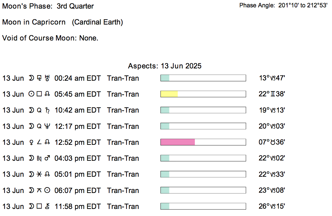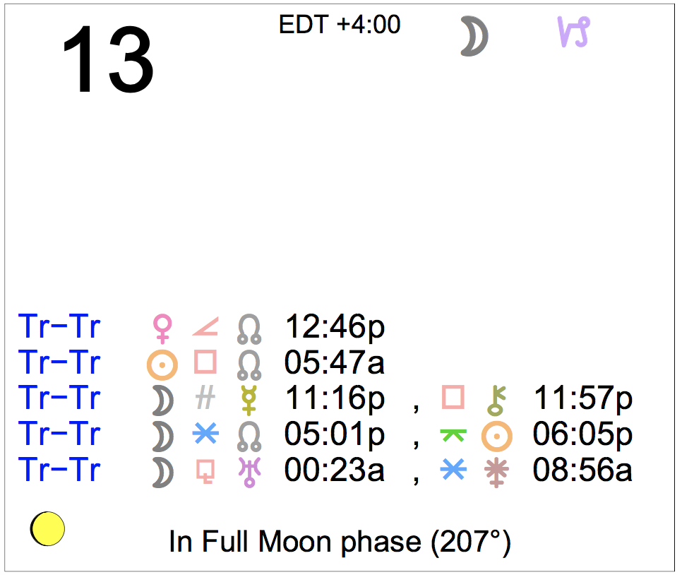 Planet Color Key: The longer the bar, the slower the aspecting planet, and the longer the duration of the planet’s transit.