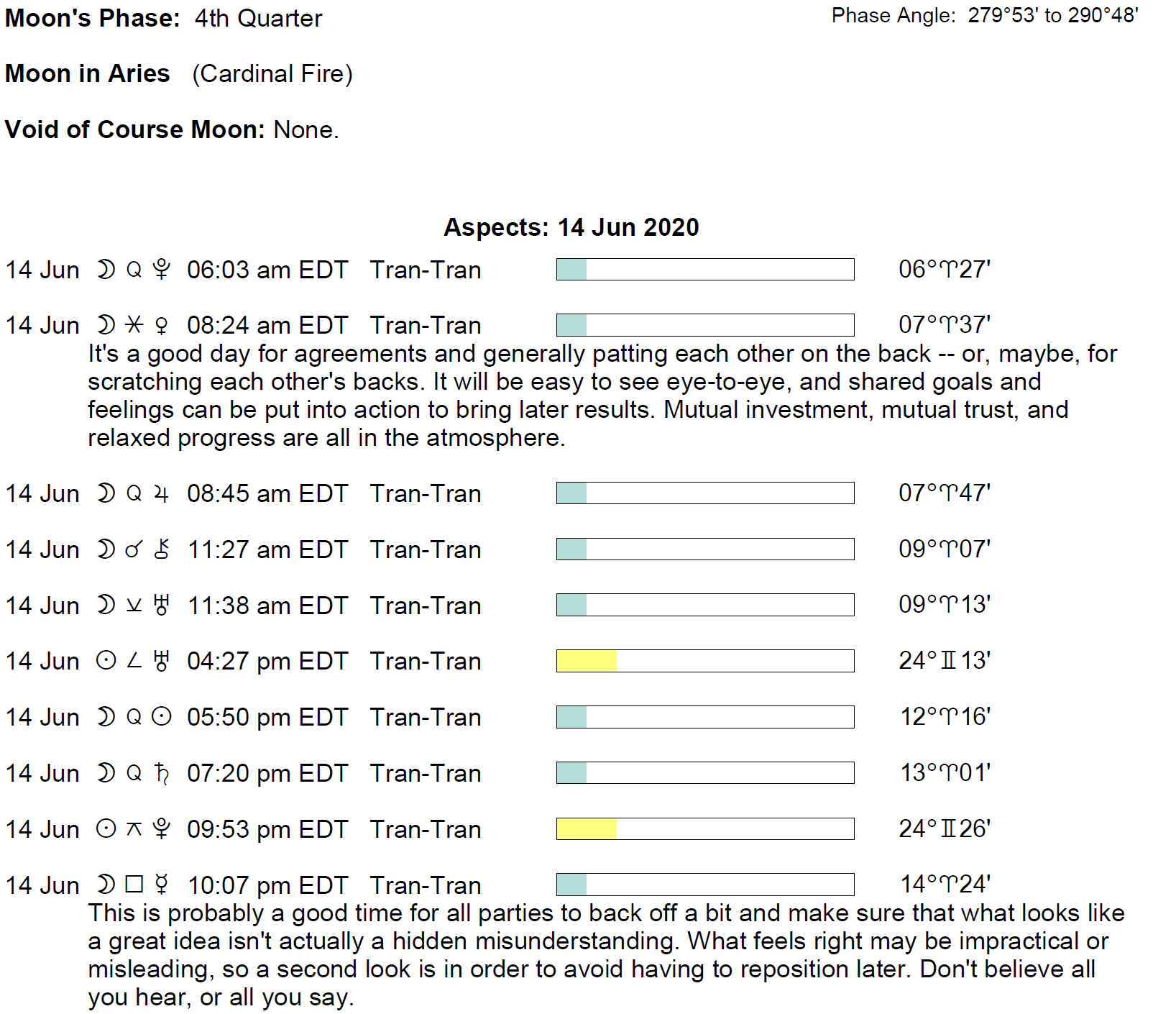 Planet Color Key: The longer the bar, the slower the aspecting planet and the longer the duration of the planet’s transit.