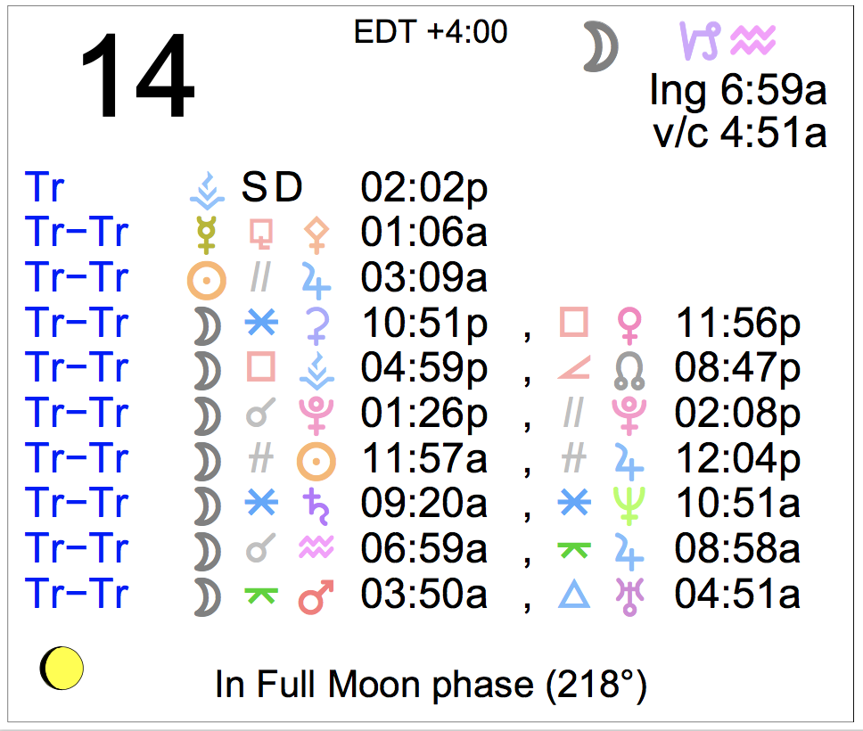 Planet Color Key: The longer the bar, the slower the aspecting planet, and the longer the duration of the planet’s transit.