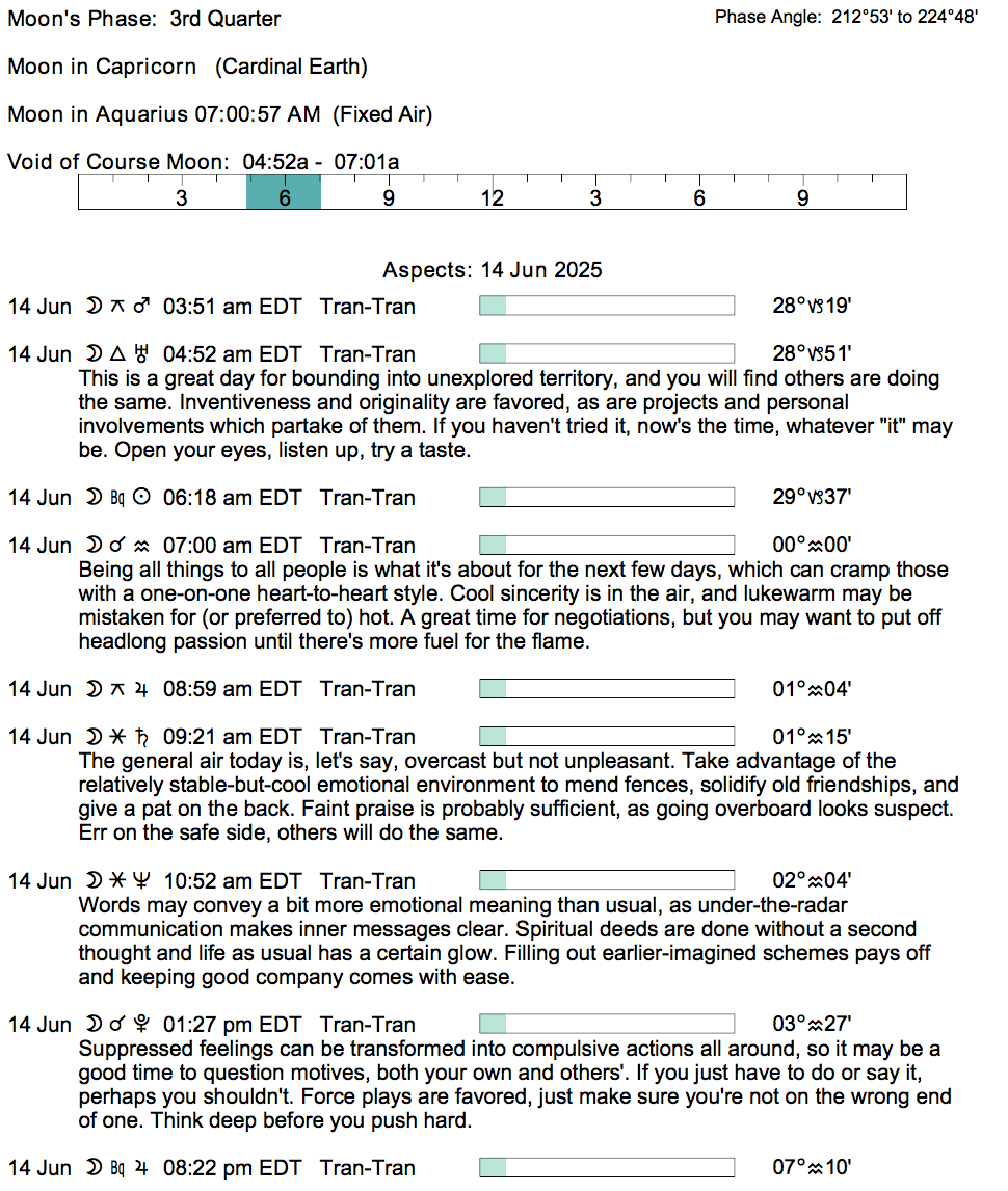 - A void Moon period occurs from 4:51 AM to 6:59 AM today.