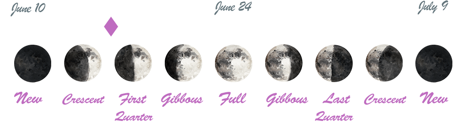 - A New Moon/Solar Eclipse occurred on the 10th, and a First Quarter Moon will happen on June 17th.