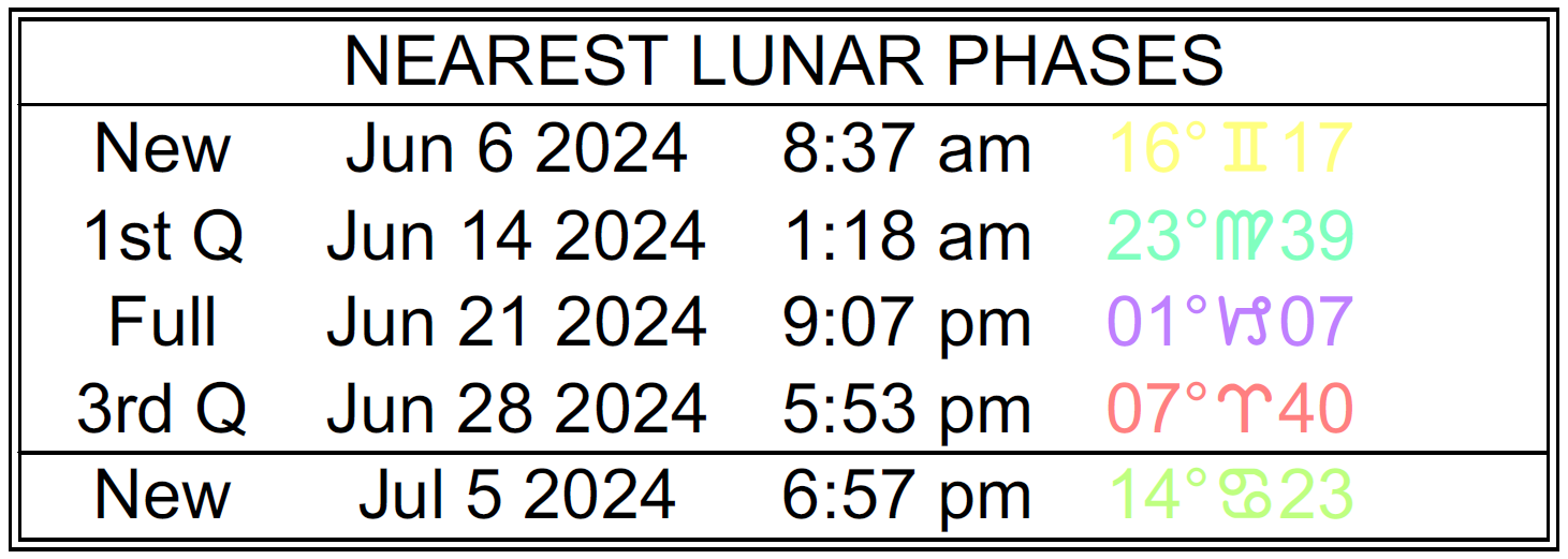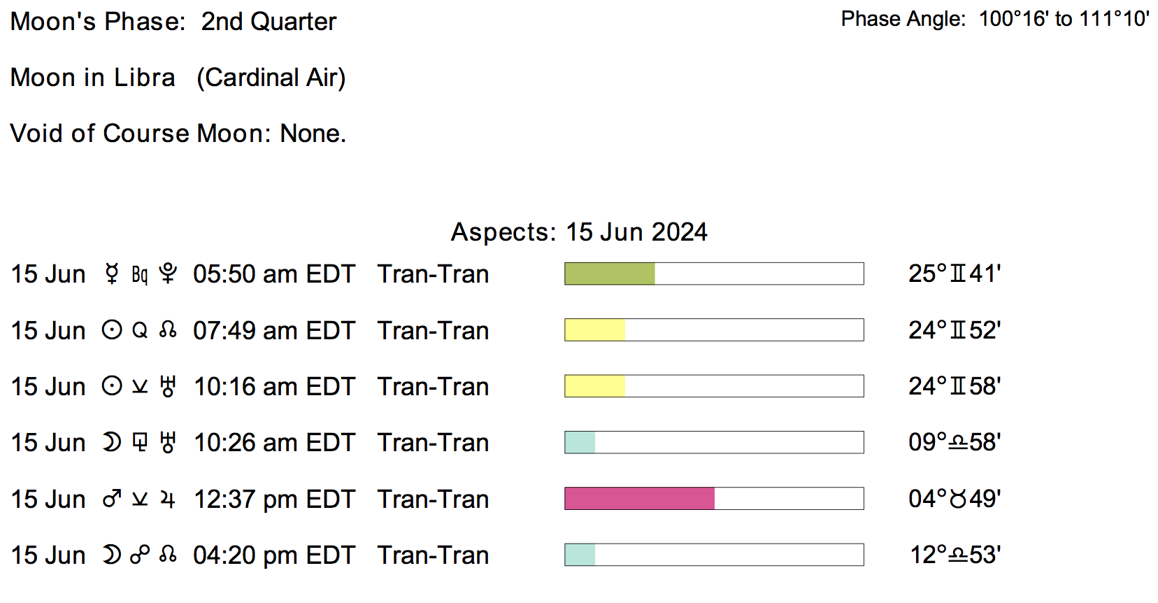 Planet Color Key: The longer the bar, the slower the aspecting planet, and the longer the duration of the planet’s transit.