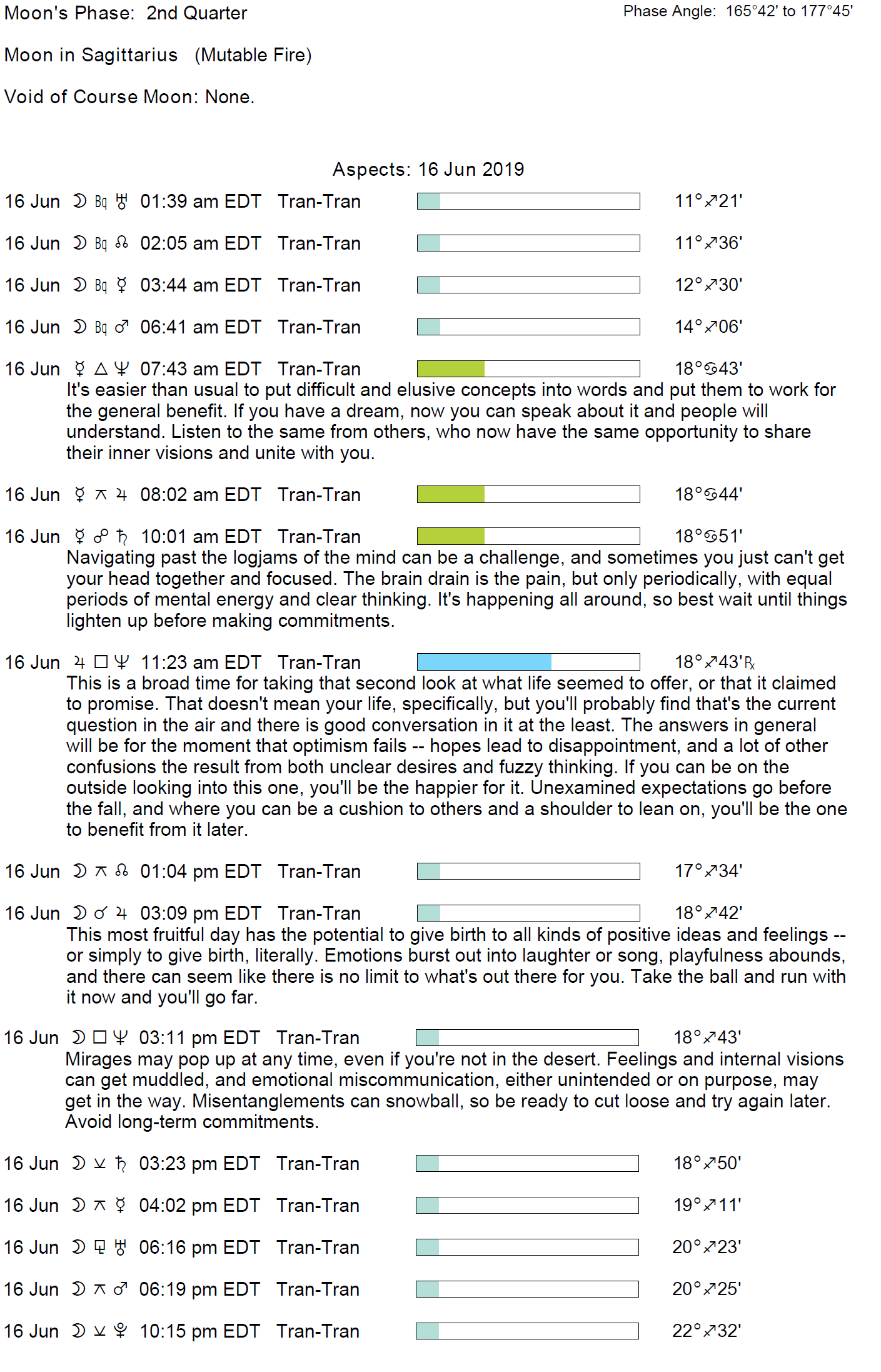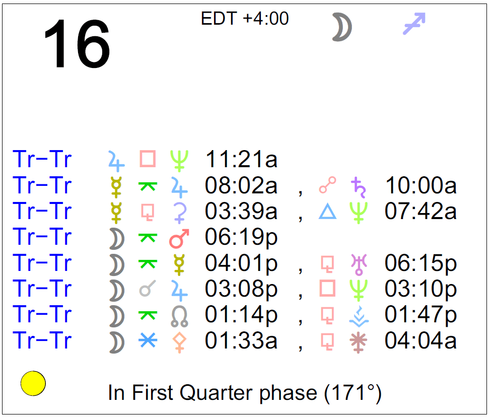 Planet Color Key: The longer the bar, the slower the aspecting planet and the longer the duration of the planet’s transit.