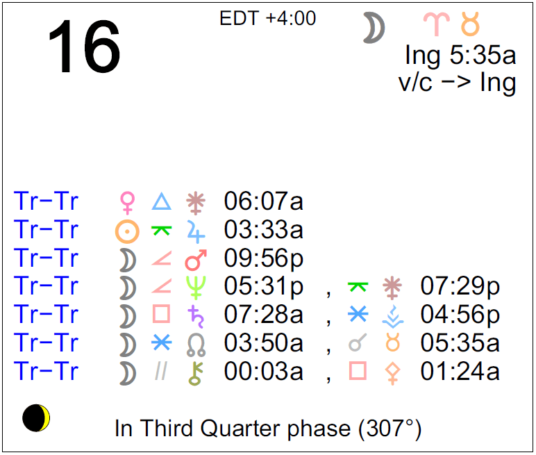 - The Last Quarter Moon occurred on the 13th, and the New Moon (Solar Eclipse) will occur on the 21st.