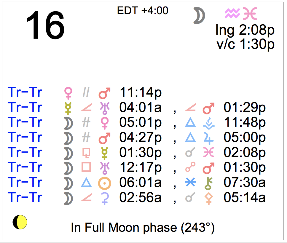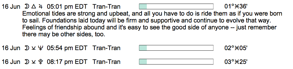 Planet Color Key: The longer the bar, the slower the aspecting planet, and the longer the duration of the planet’s transit.