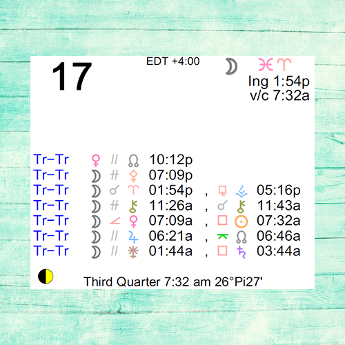 **I suggest paying close attention to applying aspects. The energy of the aspect builds as it gets closer to exact. Once an aspect involving inner planets has happened, it’s over. Separating aspects are good to know for context, but in terms of energy that is with us today, applying aspects are most important. (This is the case for daily astrology influences involving inner planets, which pass quickly, and not natal astrology aspects, which are with us for a lifetime).