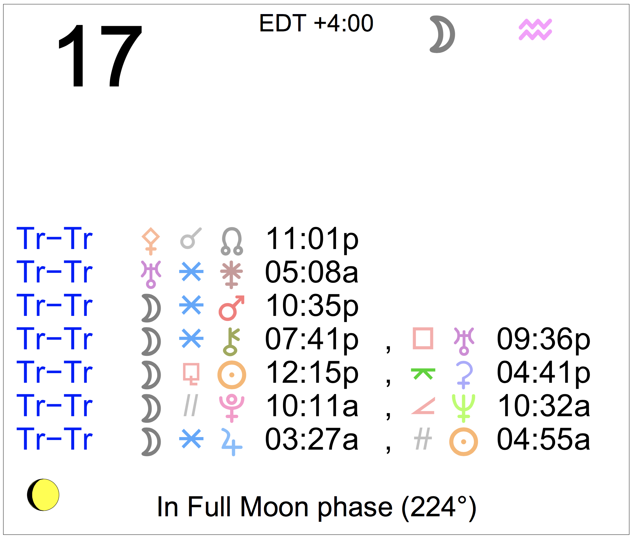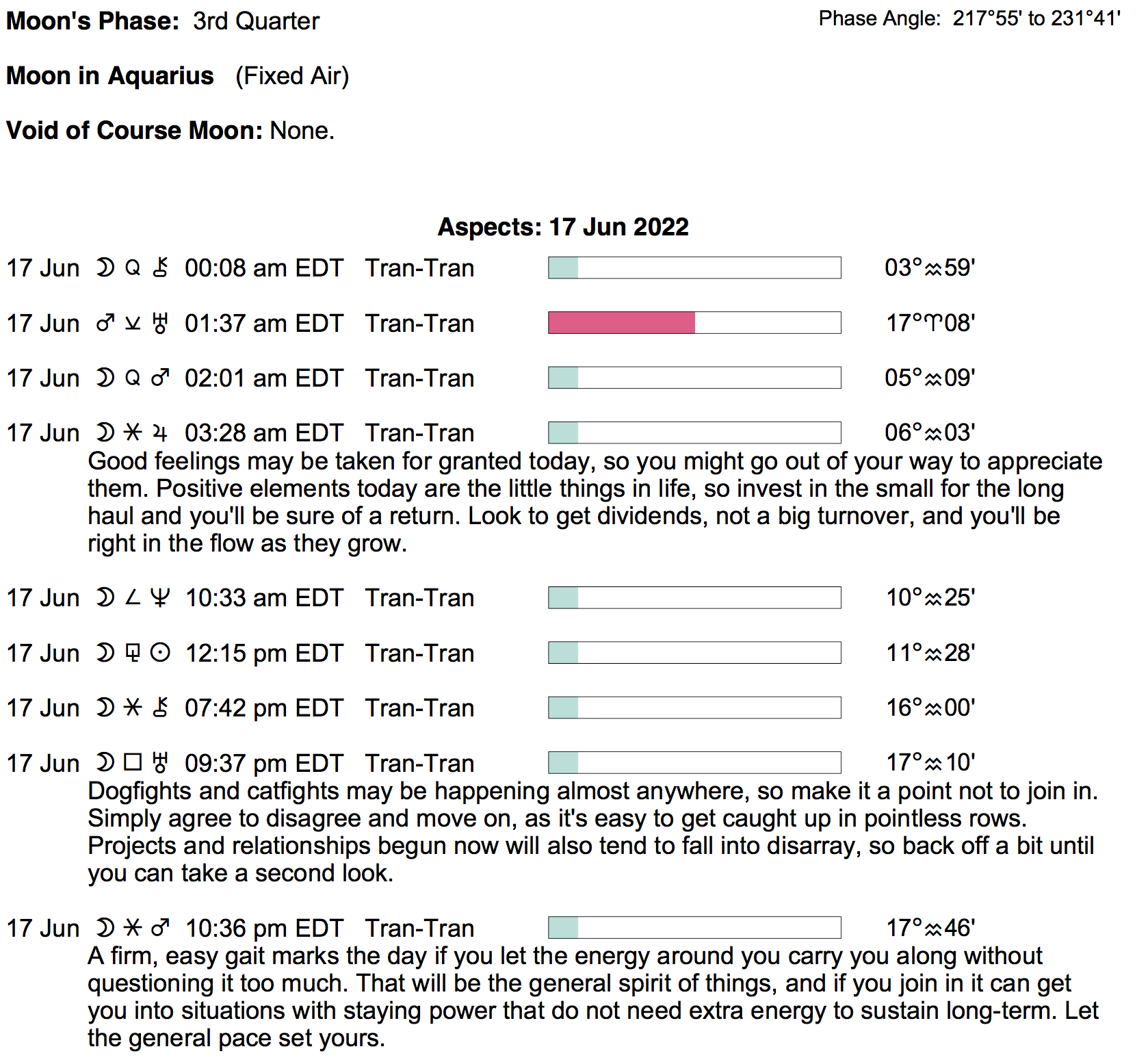 Planet Color Key: The longer the bar, the slower the aspecting planet, and the longer the duration of the planet’s transit.