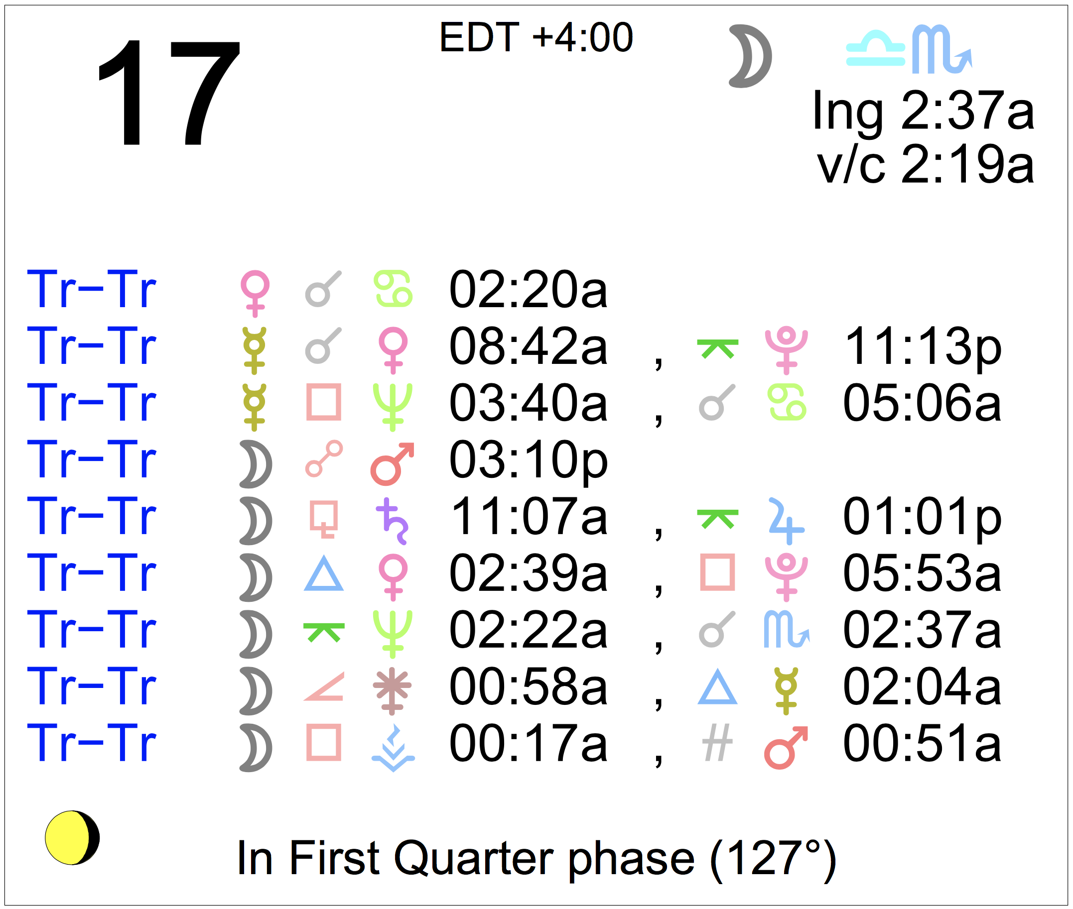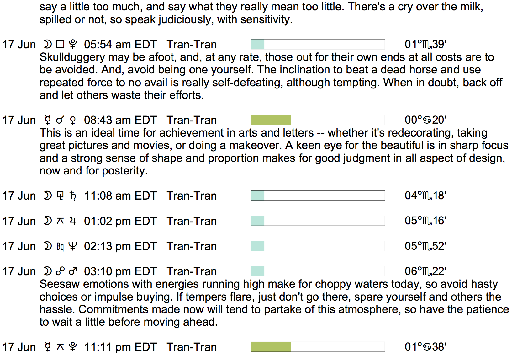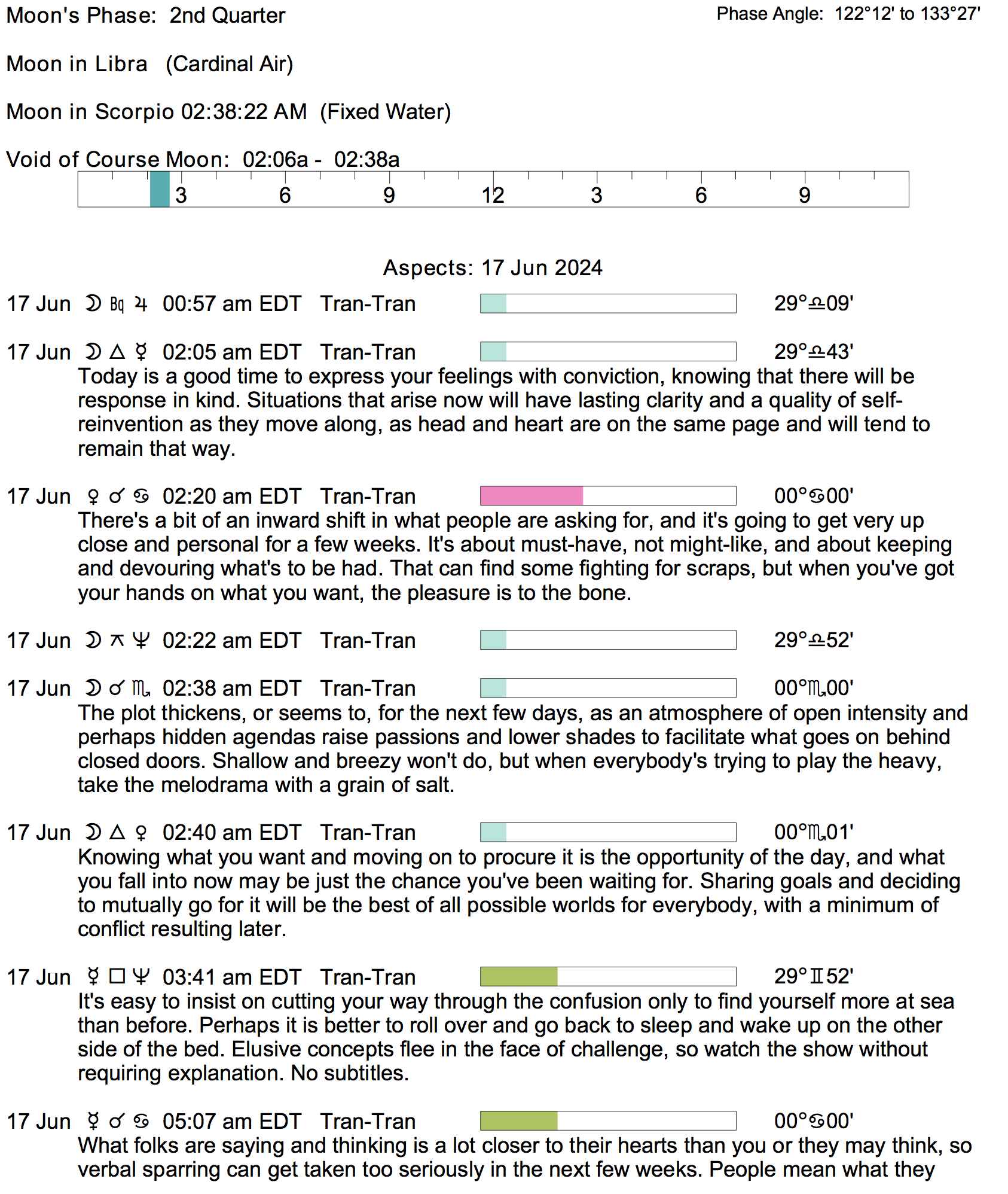 Planet Color Key: The longer the bar, the slower the aspecting planet, and the longer the duration of the planet’s transit.