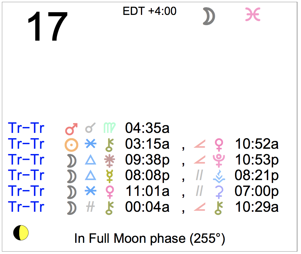 Planet Color Key: The longer the bar, the slower the aspecting planet, and the longer the duration of the planet’s transit.