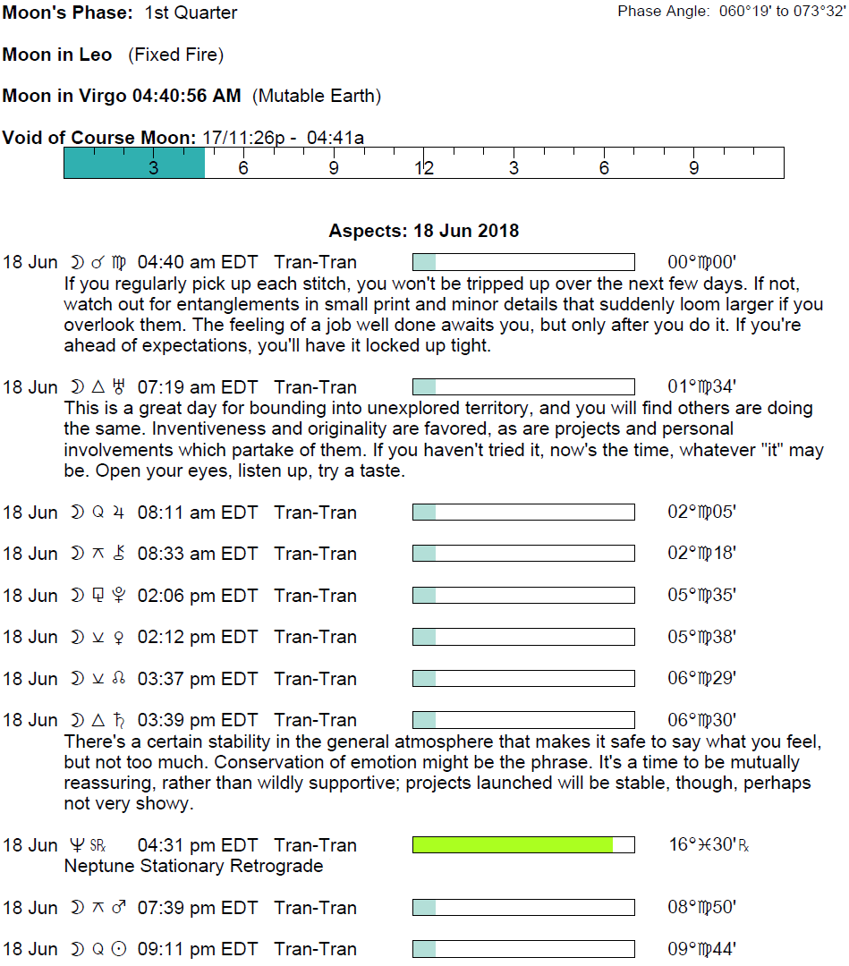 Planet Color Key: The longer the bar, the slower the aspecting planet and the longer the duration of the planet’s transit.
