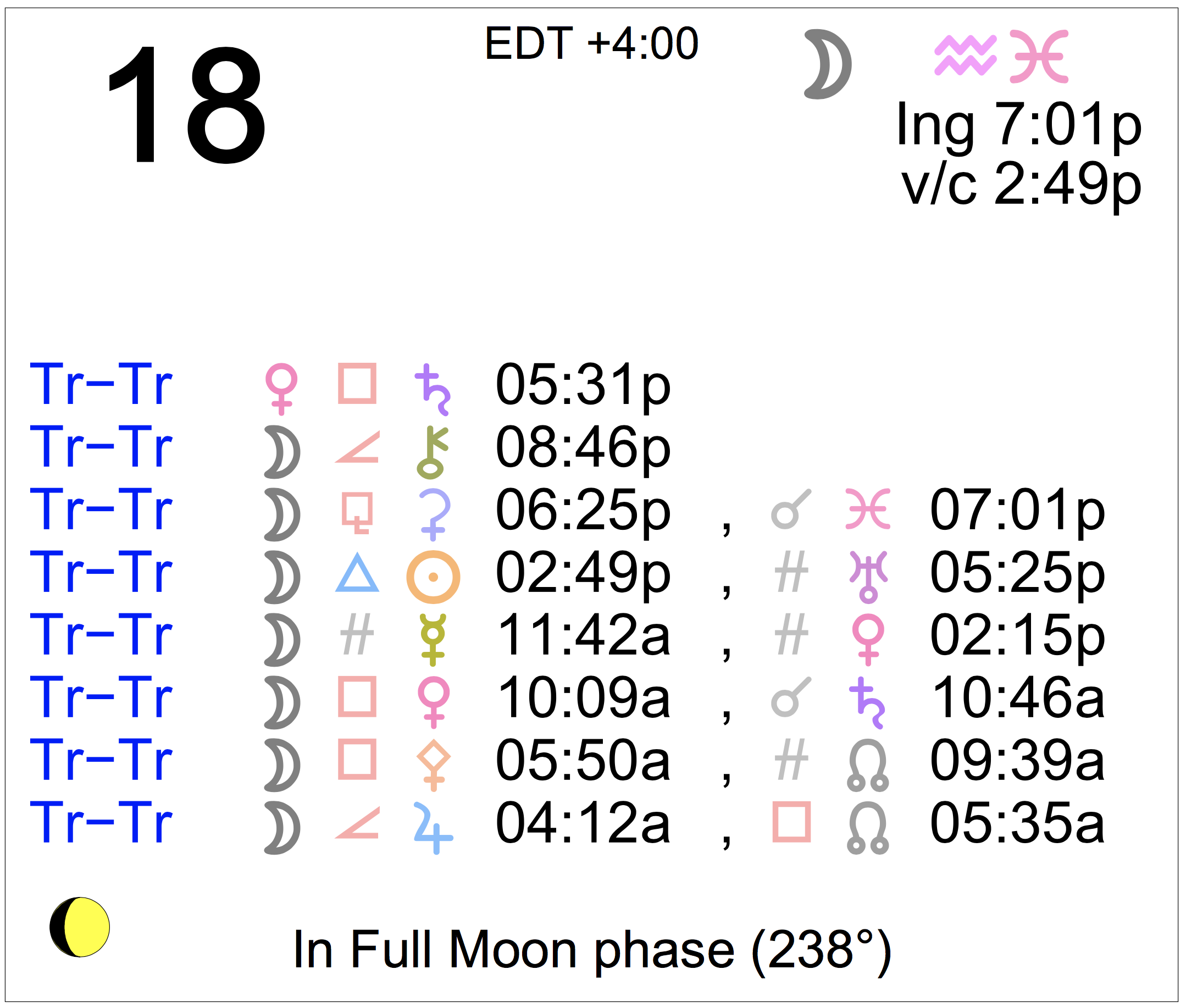 - The Moon is in Aquarius until 7:01 PM, after which the Moon is in Pisces.