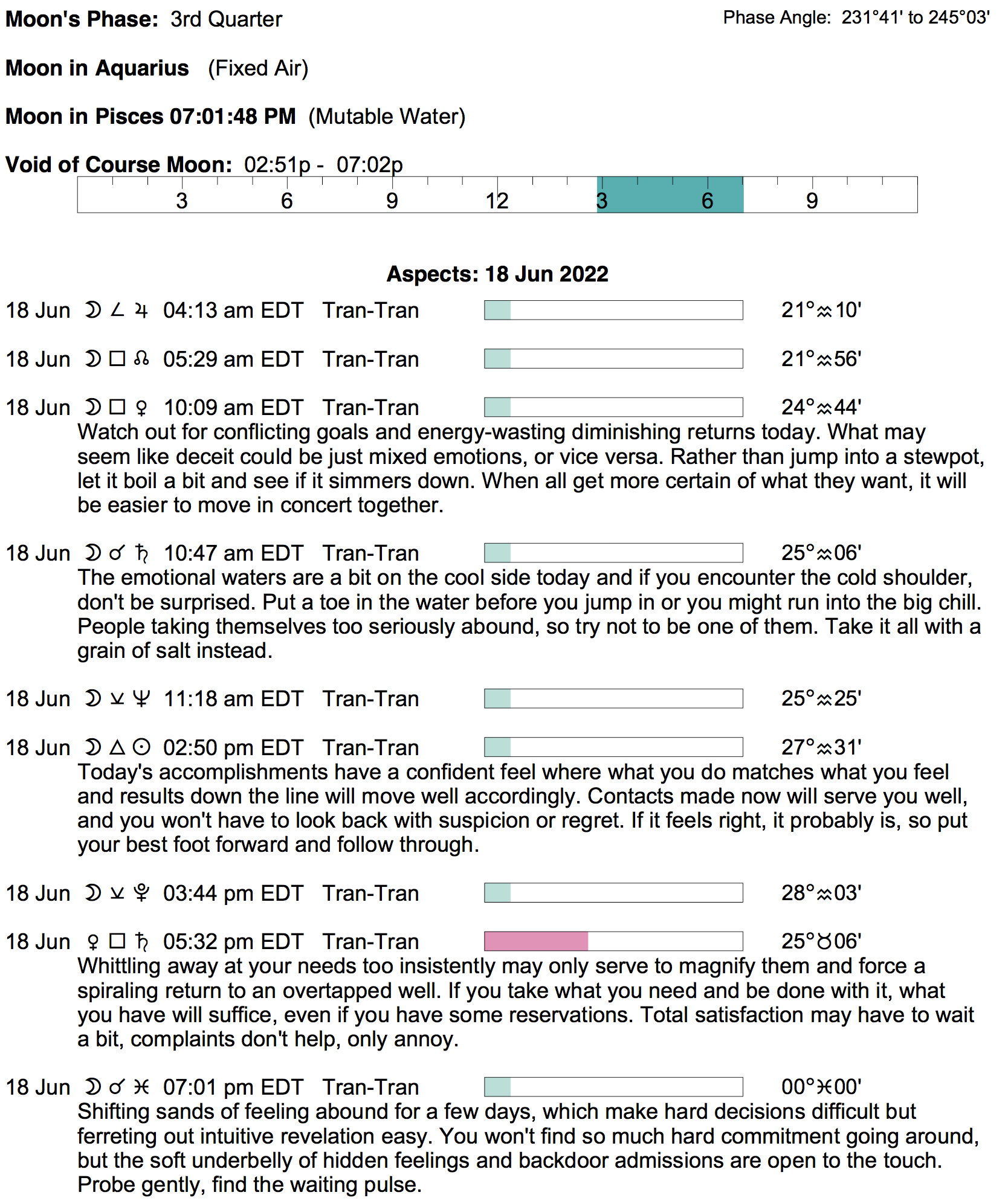 Planet Color Key: The longer the bar, the slower the aspecting planet, and the longer the duration of the planet’s transit.