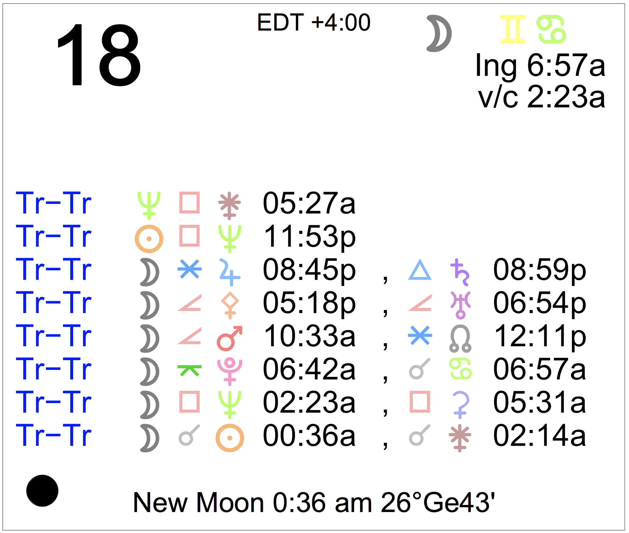 - The New Moon occurs today at 12:36 AM in the sign of Gemini.
