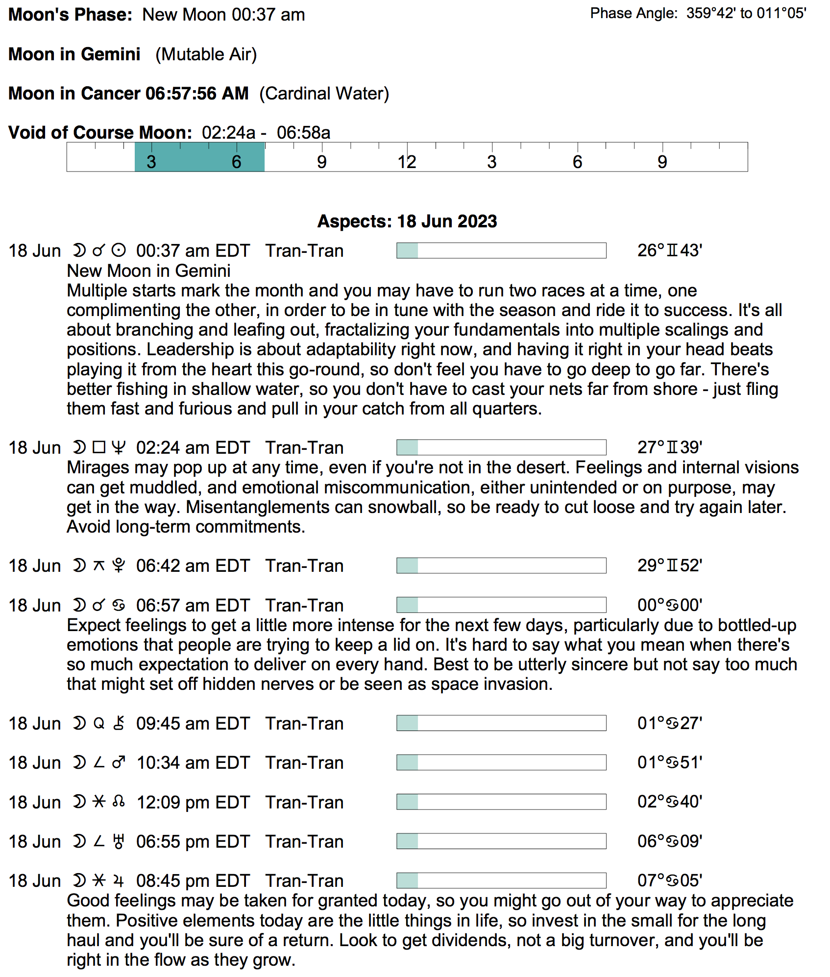 - A void Moon period occurs from 2:23 AM to 6:57 AM today.