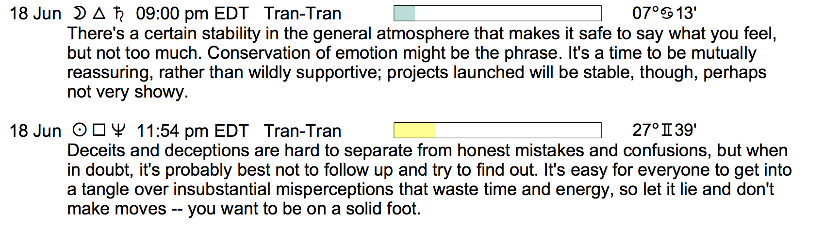 Planet Color Key: The longer the bar, the slower the aspecting planet, and the longer the duration of the planet’s transit.