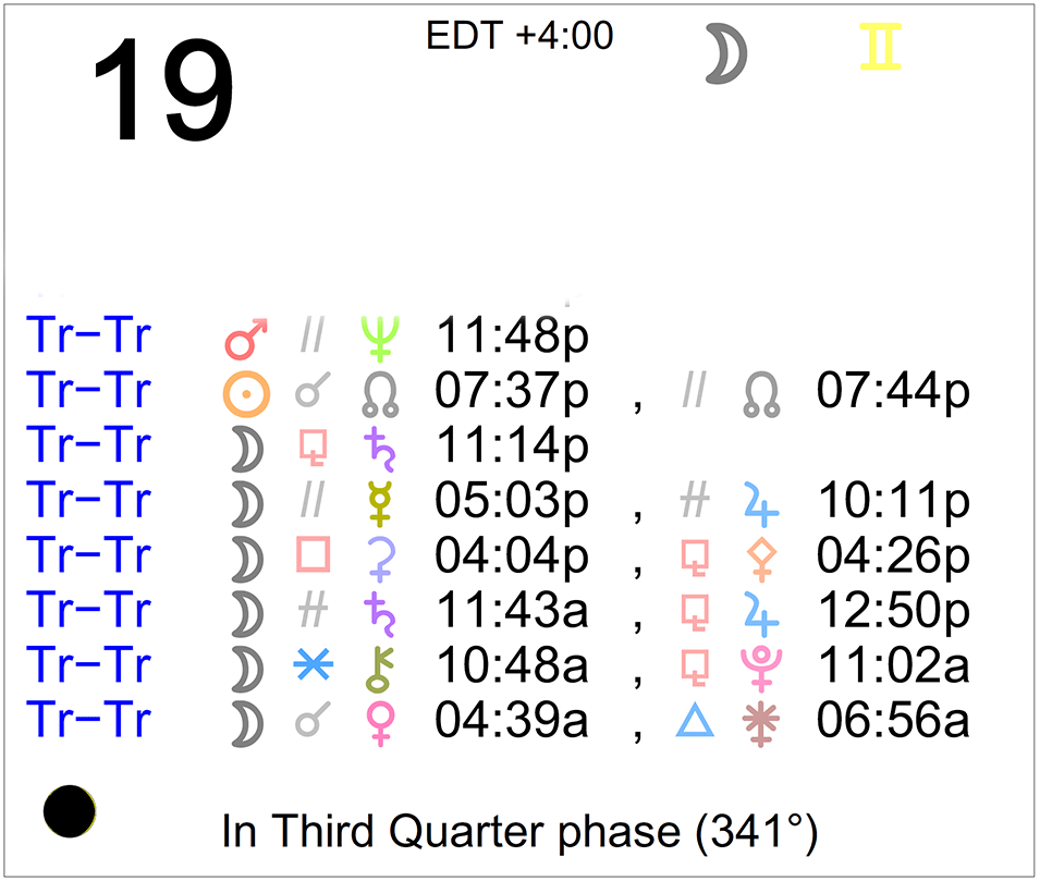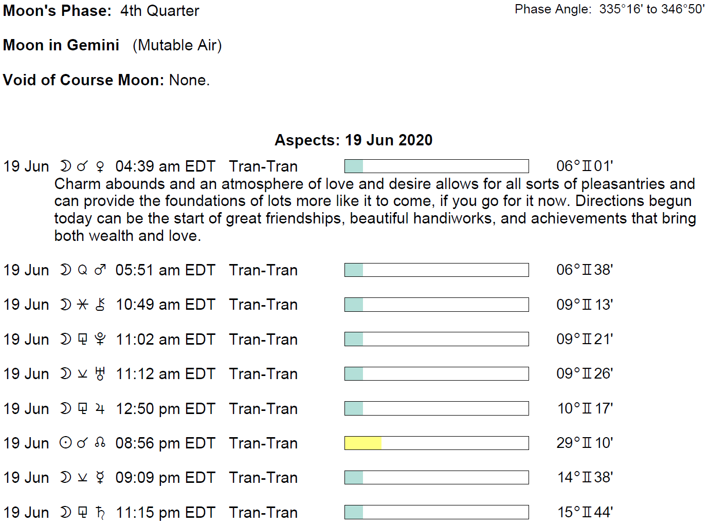 Planet Color Key: The longer the bar, the slower the aspecting planet and the longer the duration of the planet’s transit.