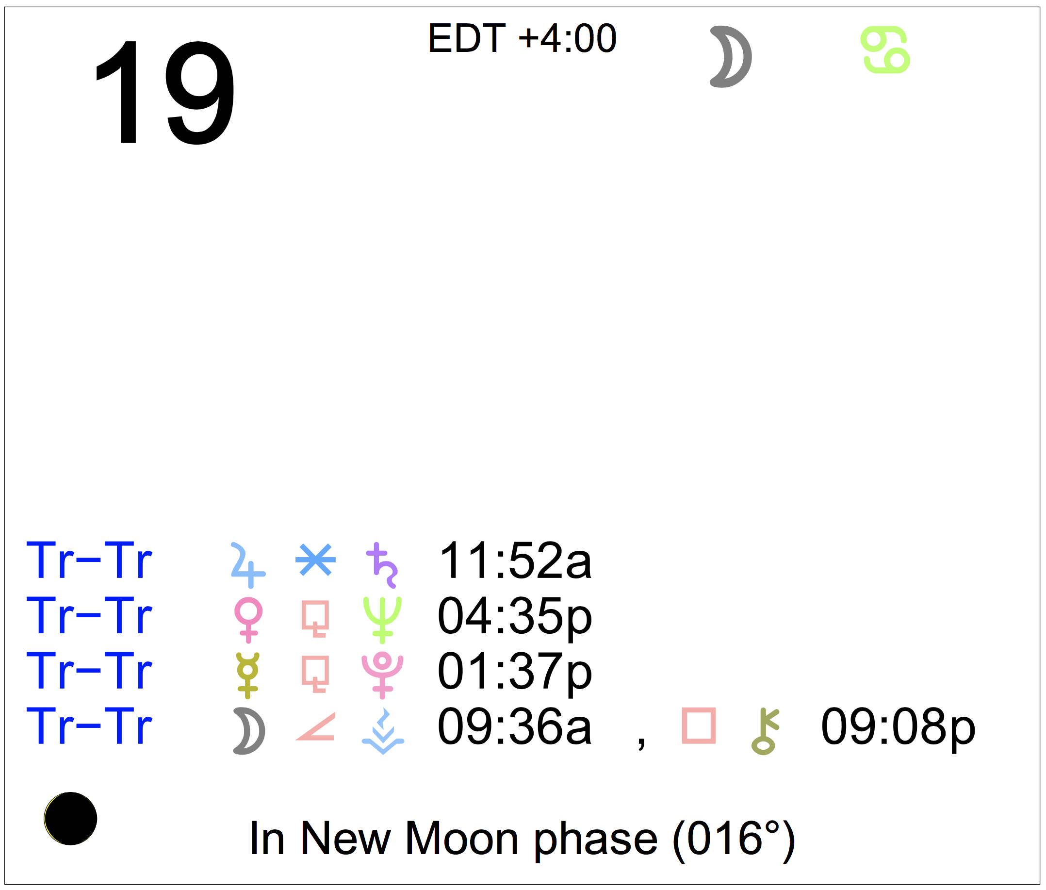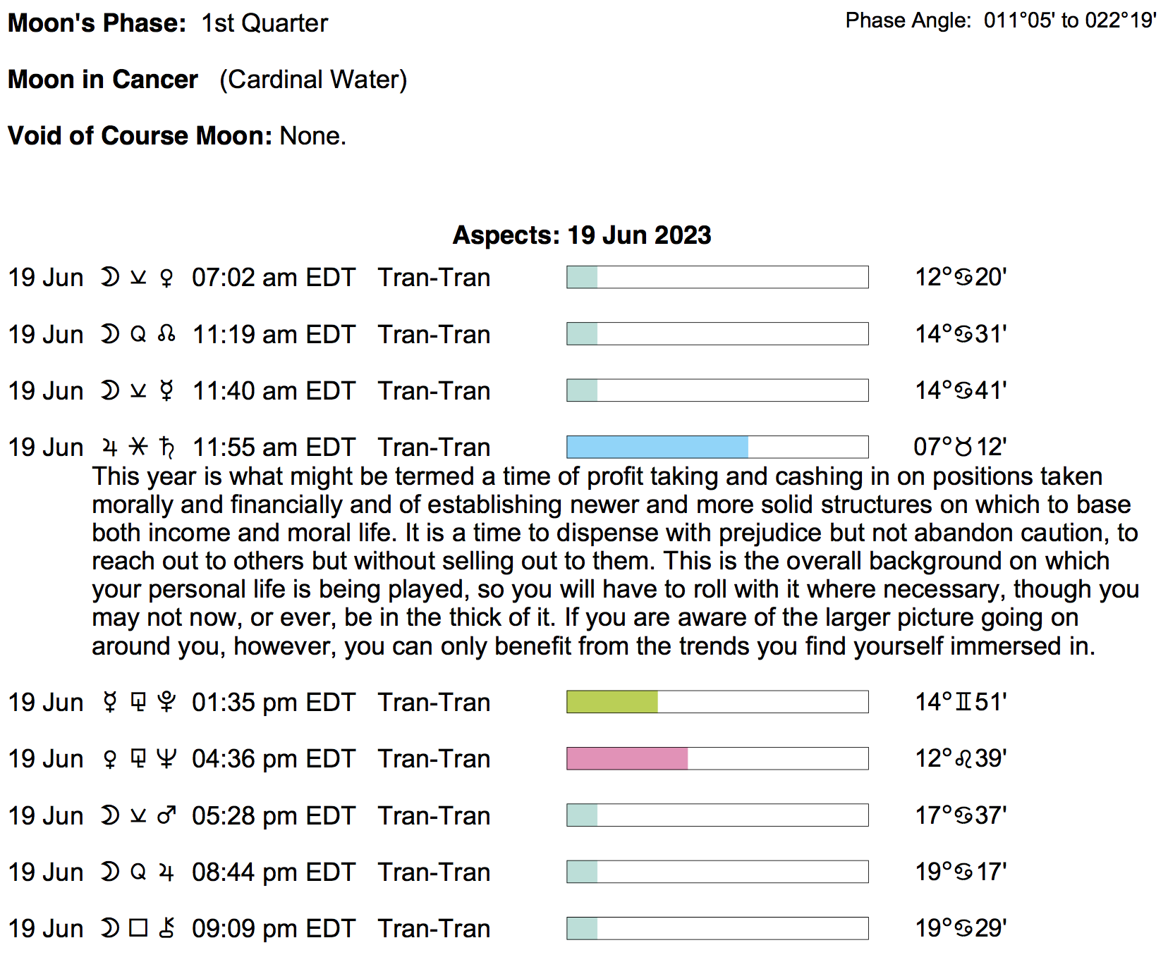 Planet Color Key: The longer the bar, the slower the aspecting planet, and the longer the duration of the planet’s transit.