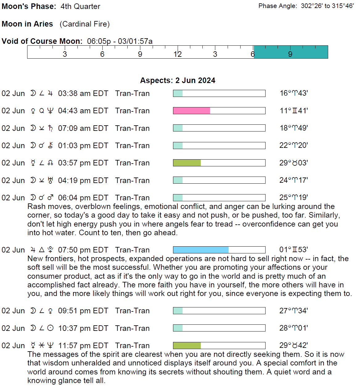 Planet Color Key: The longer the bar, the slower the aspecting planet, and the longer the duration of the planet’s transit.