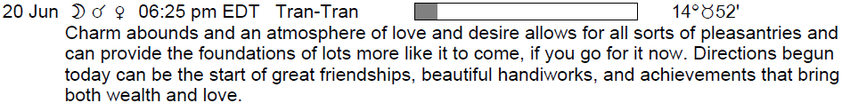 We are less inhibited and more willing to indulge ourselves. Love and romance can be favorable. Decorating, beauty treatments, the arts, creative pursuits, parties, dates, and recreation are generally favored now. There is increased sensitivity, affection, and warmth. Love is grand! Affection, love, and romance are in the air.
