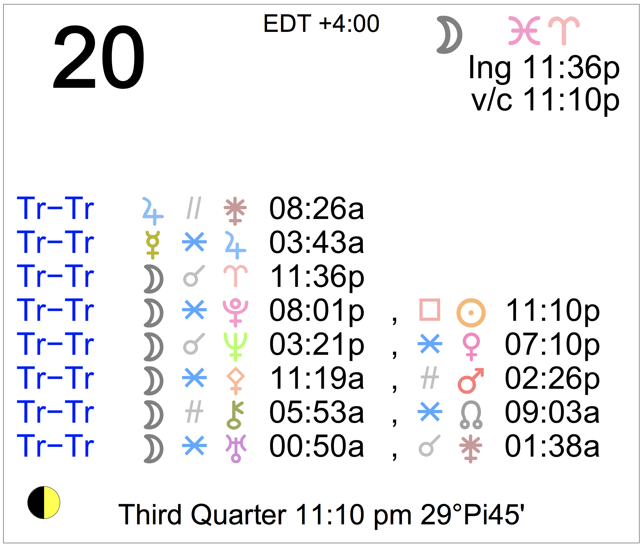 - The Moon is in Pisces until 11:36 PM, after which the Moon is in Aries.