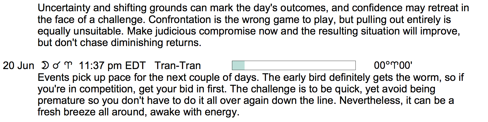 Planet Color Key: The longer the bar, the slower the aspecting planet, and the longer the duration of the planet’s transit.