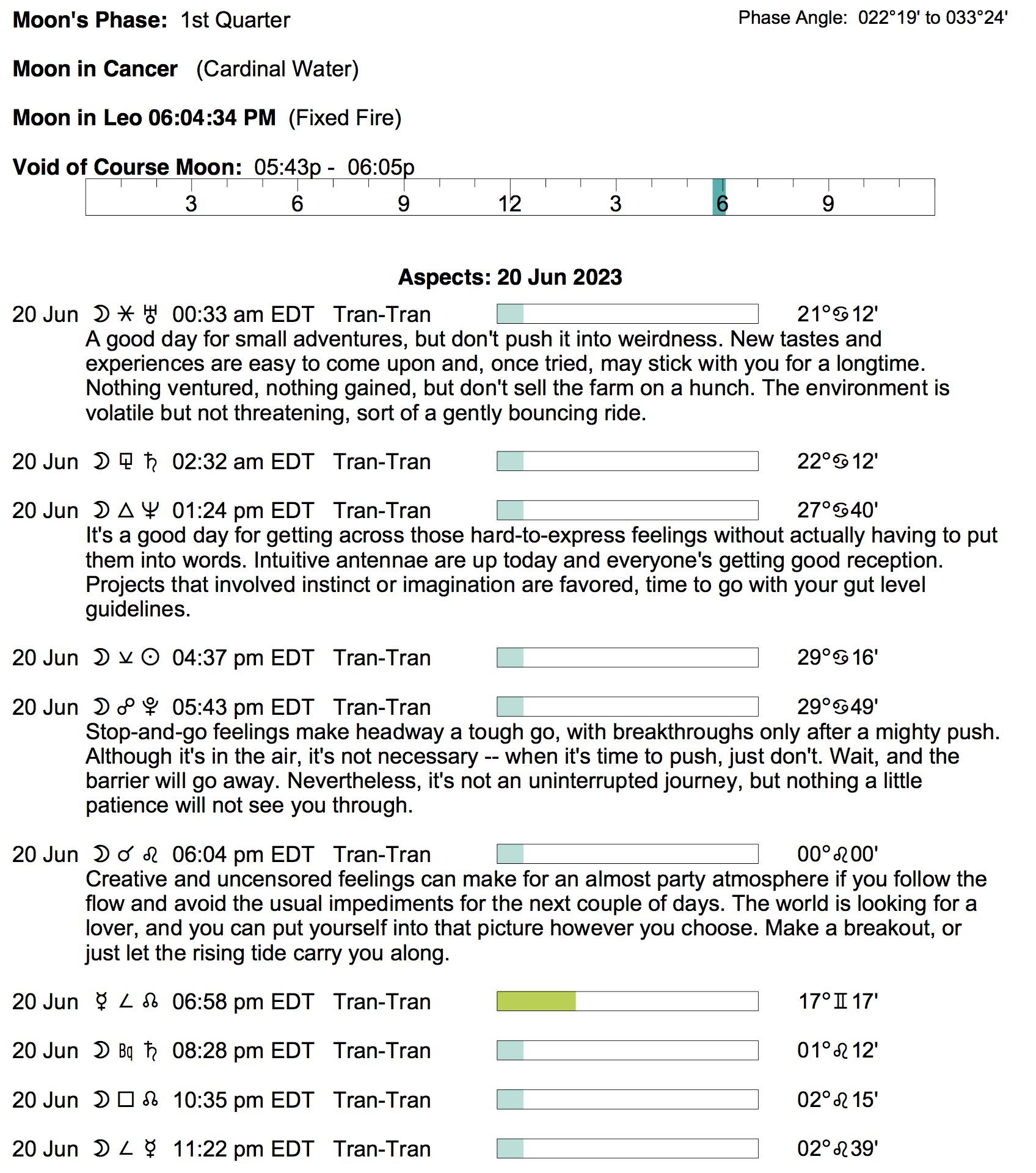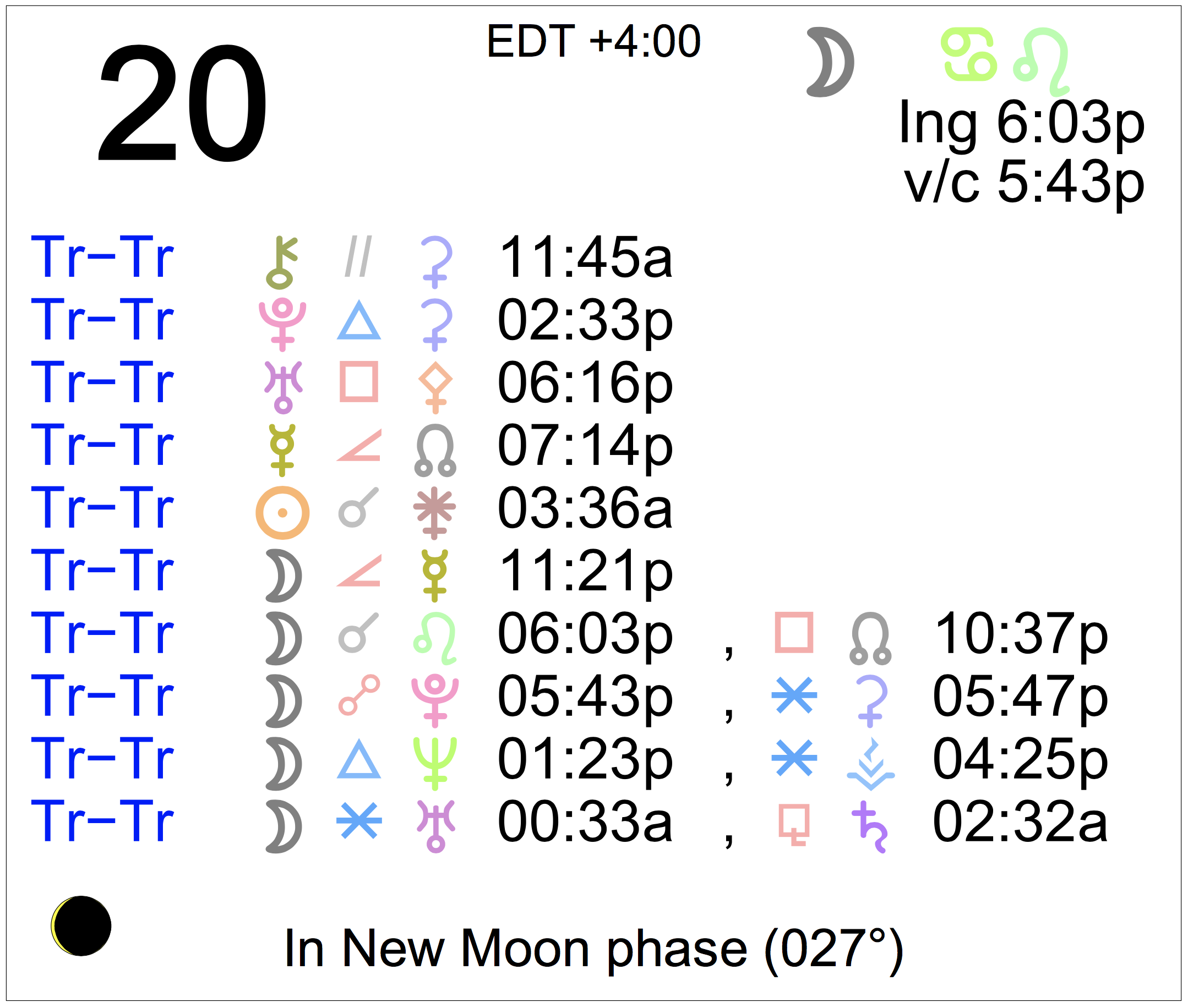 Planet Color Key: The longer the bar, the slower the aspecting planet, and the longer the duration of the planet’s transit.