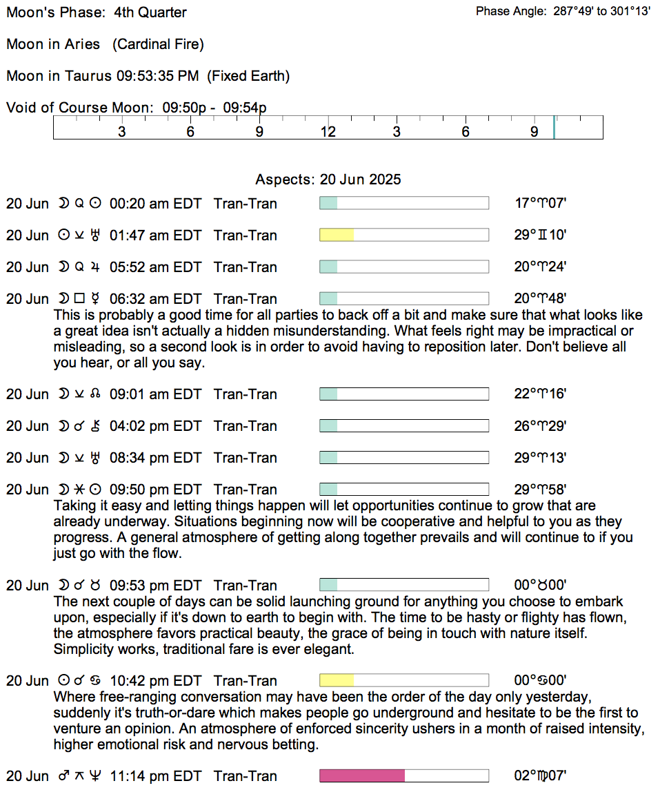 Planet Color Key: The longer the bar, the slower the aspecting planet, and the longer the duration of the planet’s transit.
