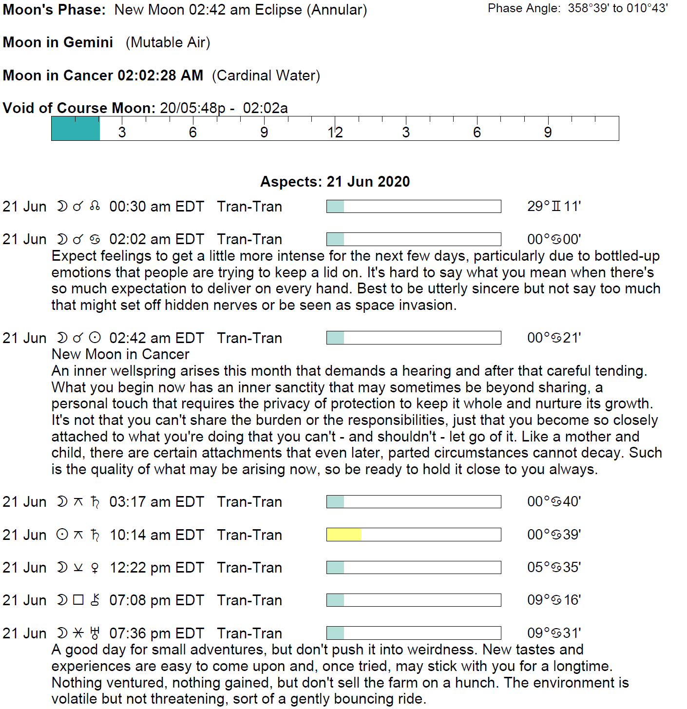 - The New Moon (Solar Eclipse) occurs today at 2:41 AM in the sign of Cancer.