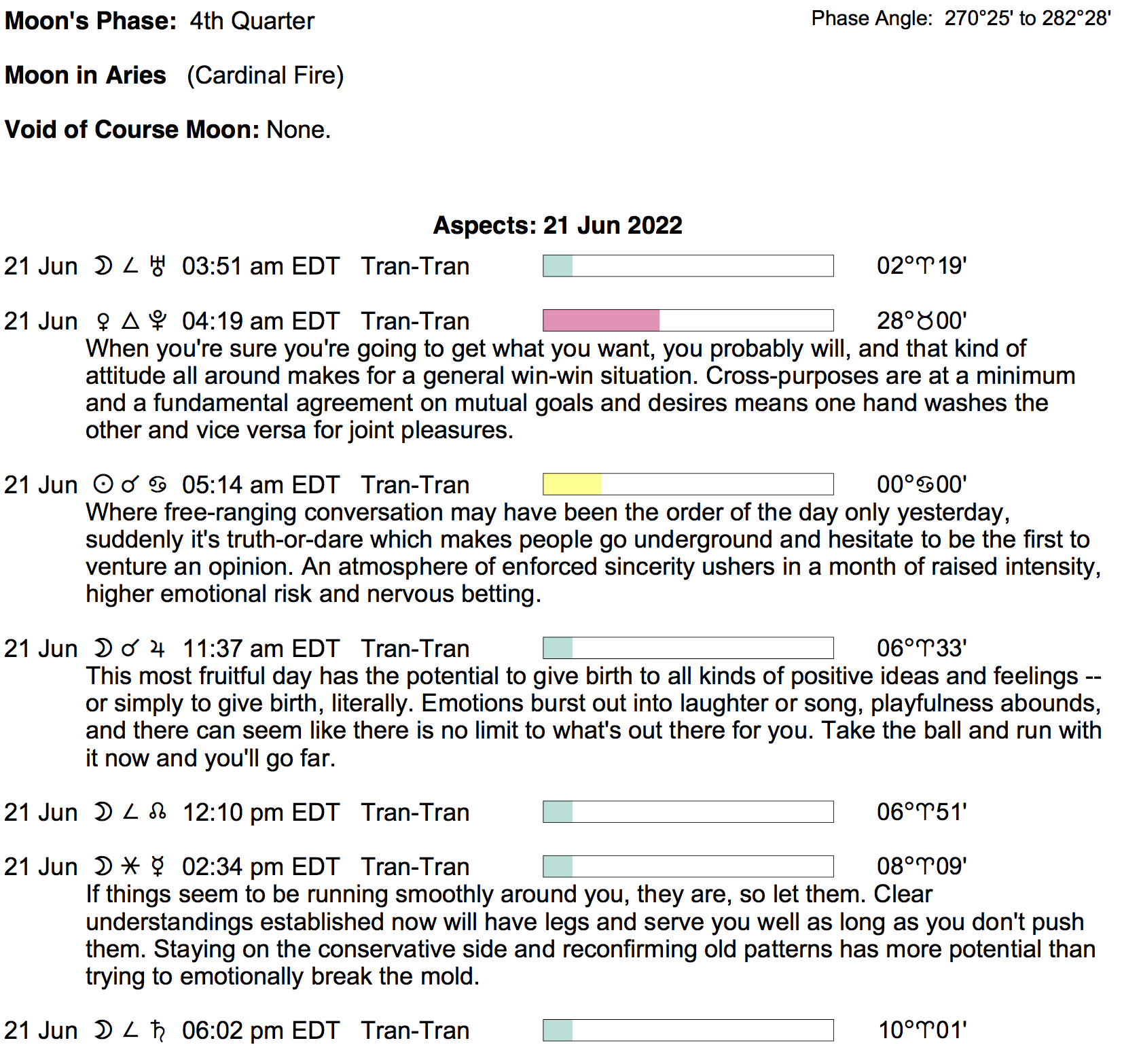 Planet Color Key: The longer the bar, the slower the aspecting planet, and the longer the duration of the planet’s transit.