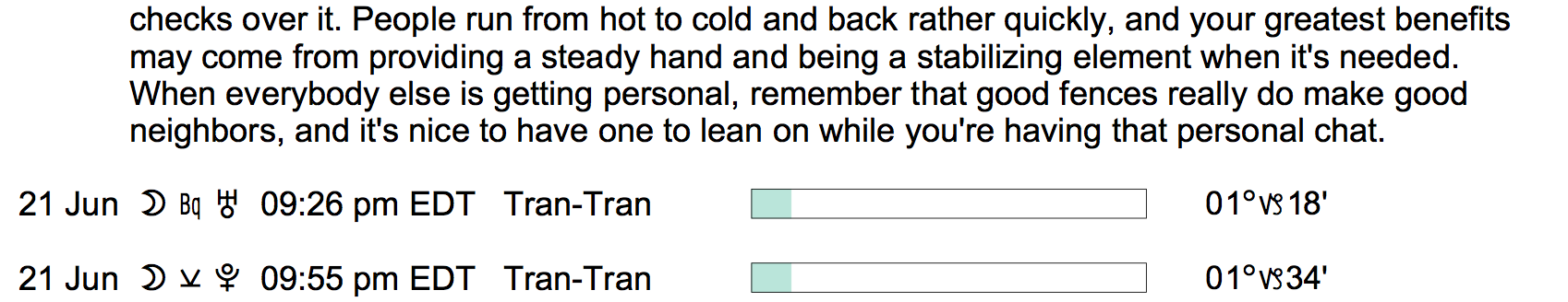 Planet Color Key: The longer the bar, the slower the aspecting planet, and the longer the duration of the planet’s transit.