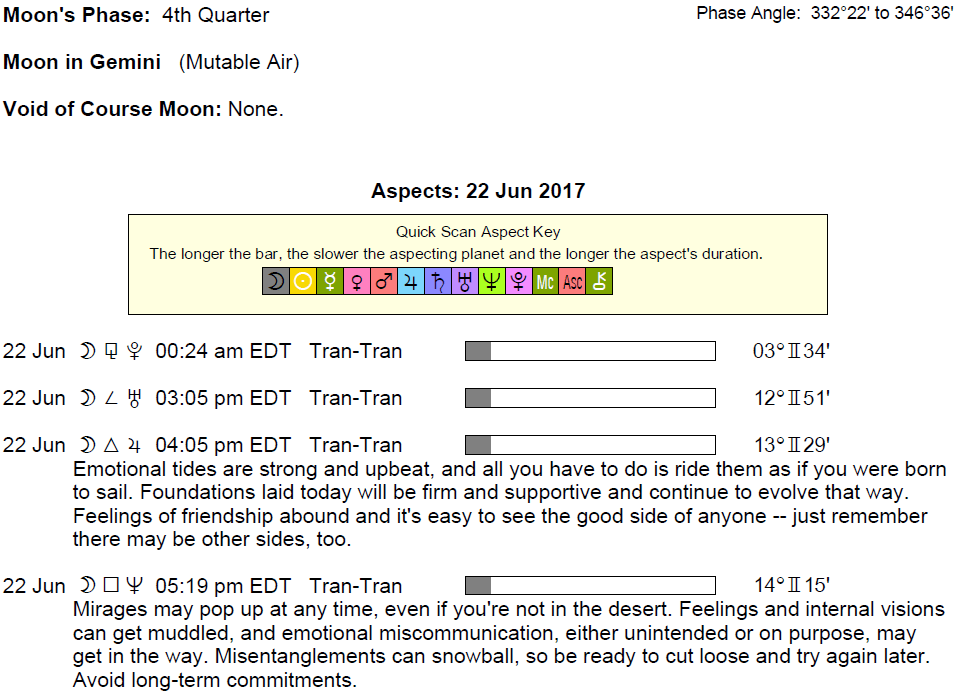The following aspects (major only) and positions are at noon (EDT) on June 22nd: