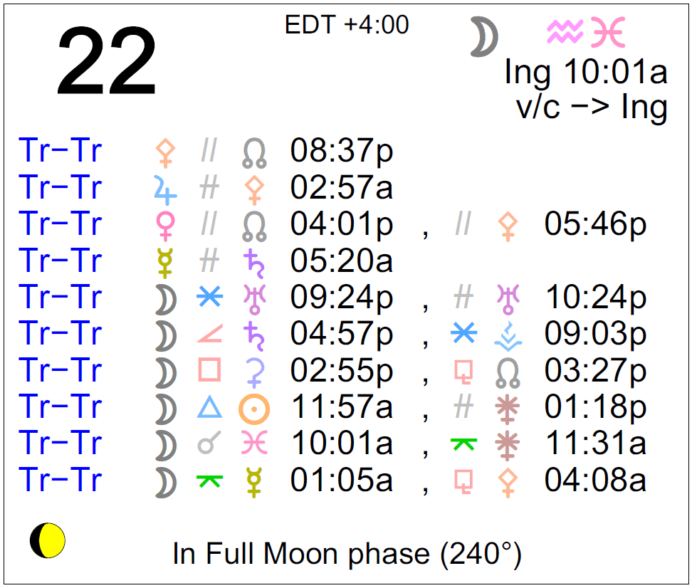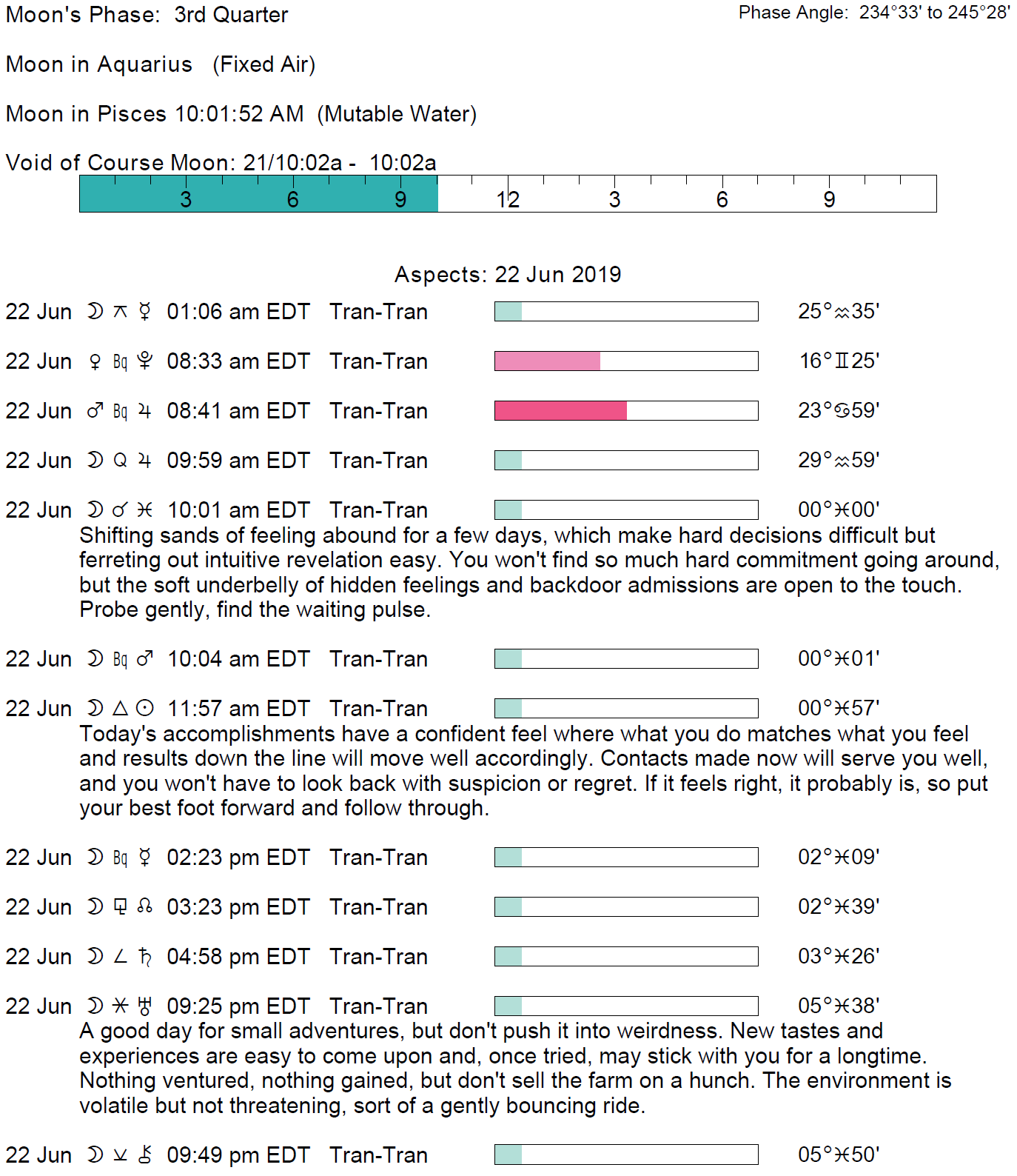 Planet Color Key: The longer the bar, the slower the aspecting planet and the longer the duration of the planet’s transit.