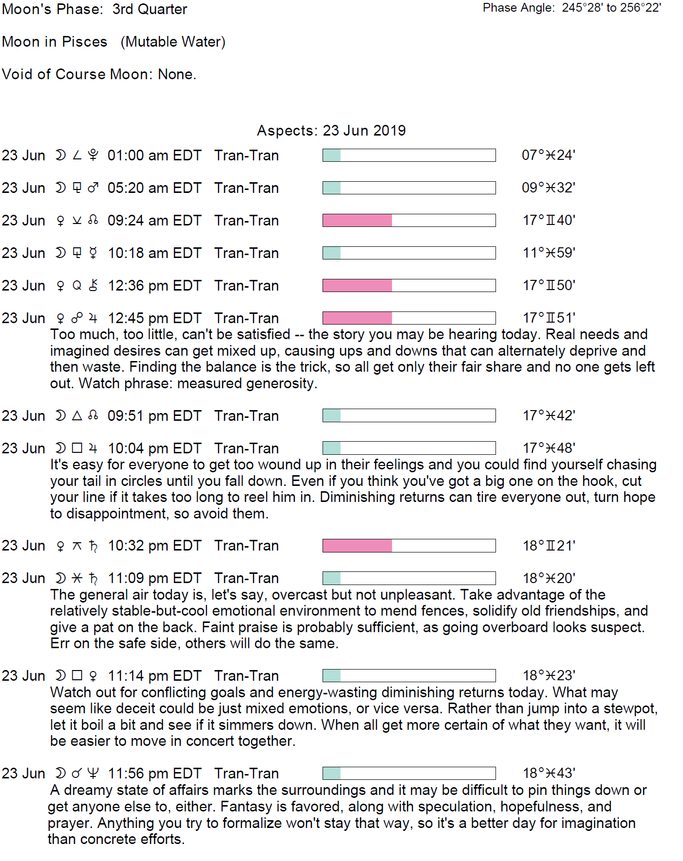 Planet Color Key: The longer the bar, the slower the aspecting planet and the longer the duration of the planet’s transit.