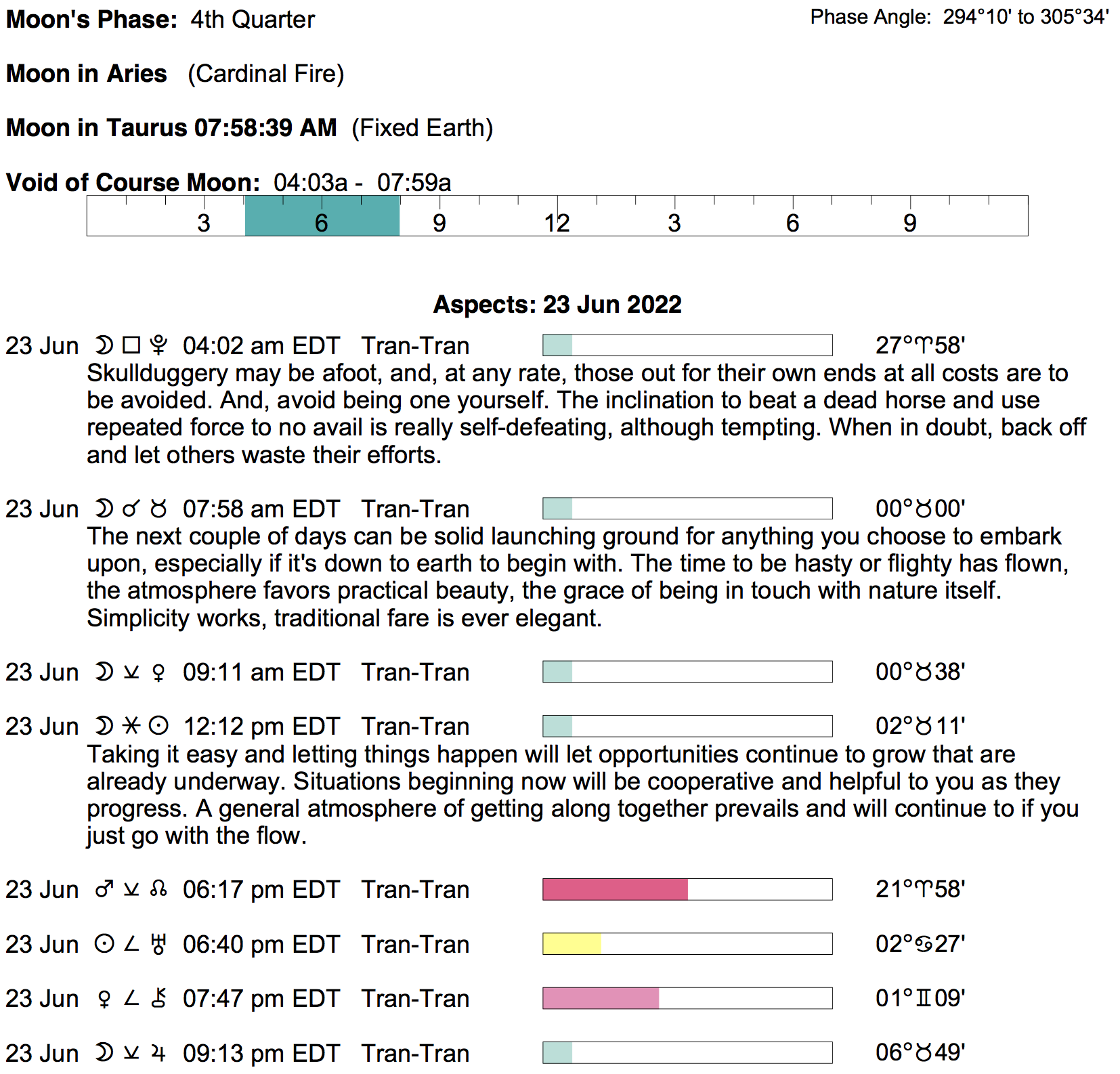 Planet Color Key: The longer the bar, the slower the aspecting planet, and the longer the duration of the planet’s transit.