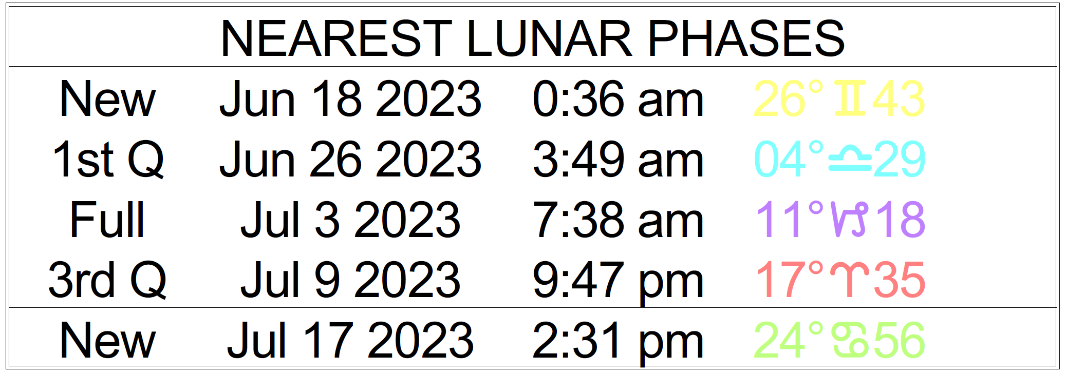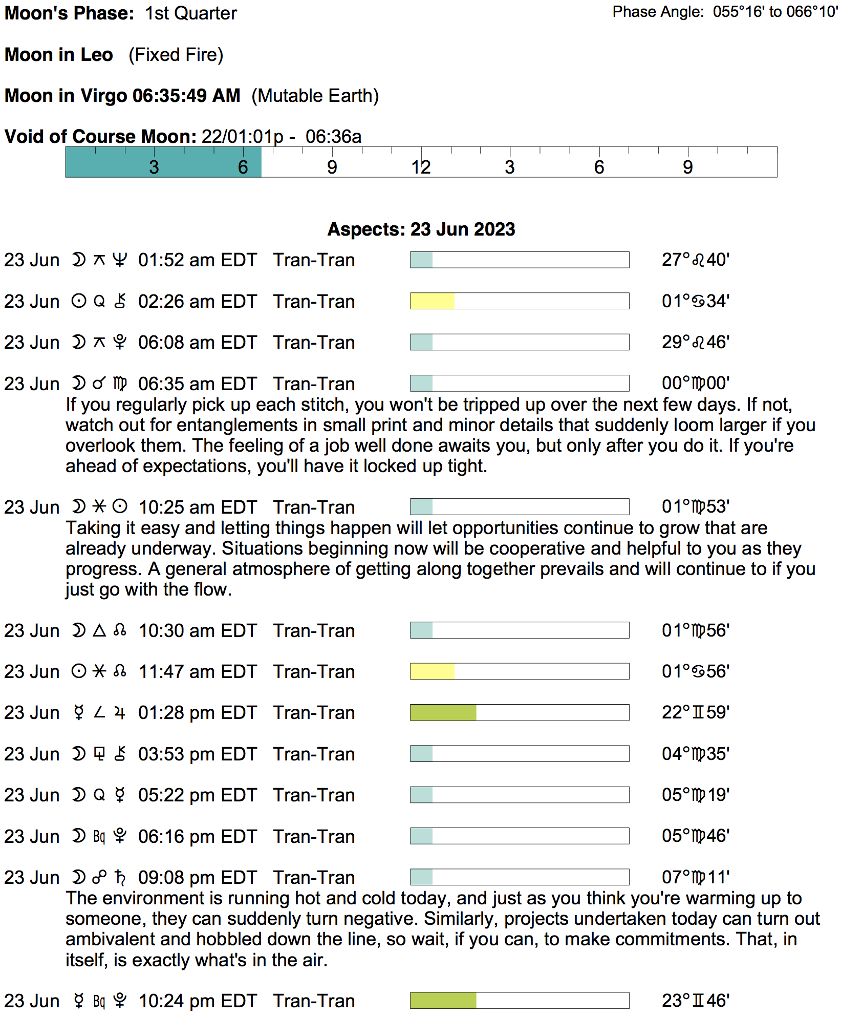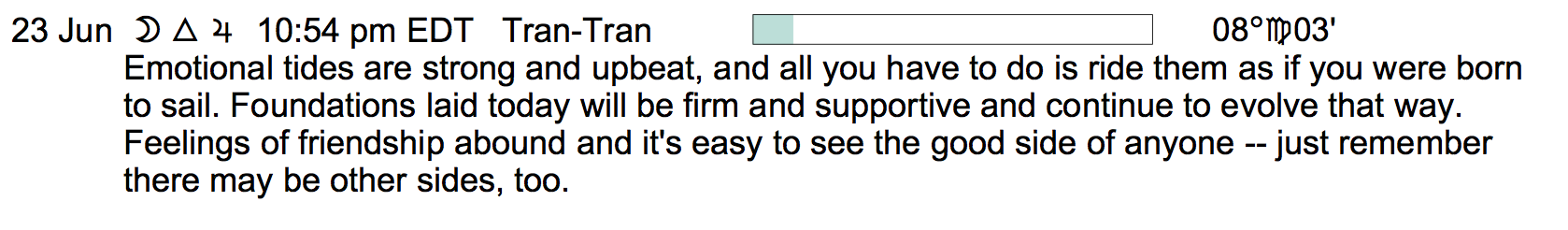 Planet Color Key: The longer the bar, the slower the aspecting planet, and the longer the duration of the planet’s transit.