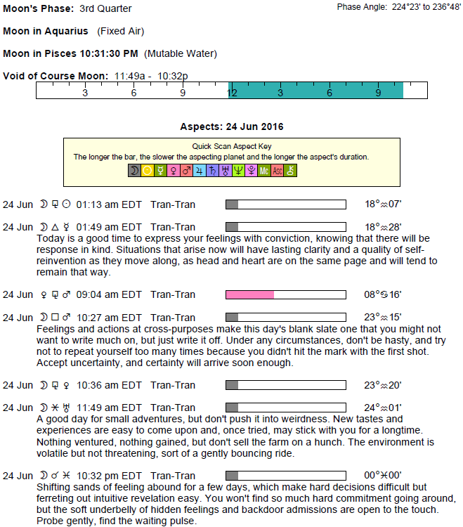 The following aspects (major only) and positions are at noon (EDT) on June 24th: