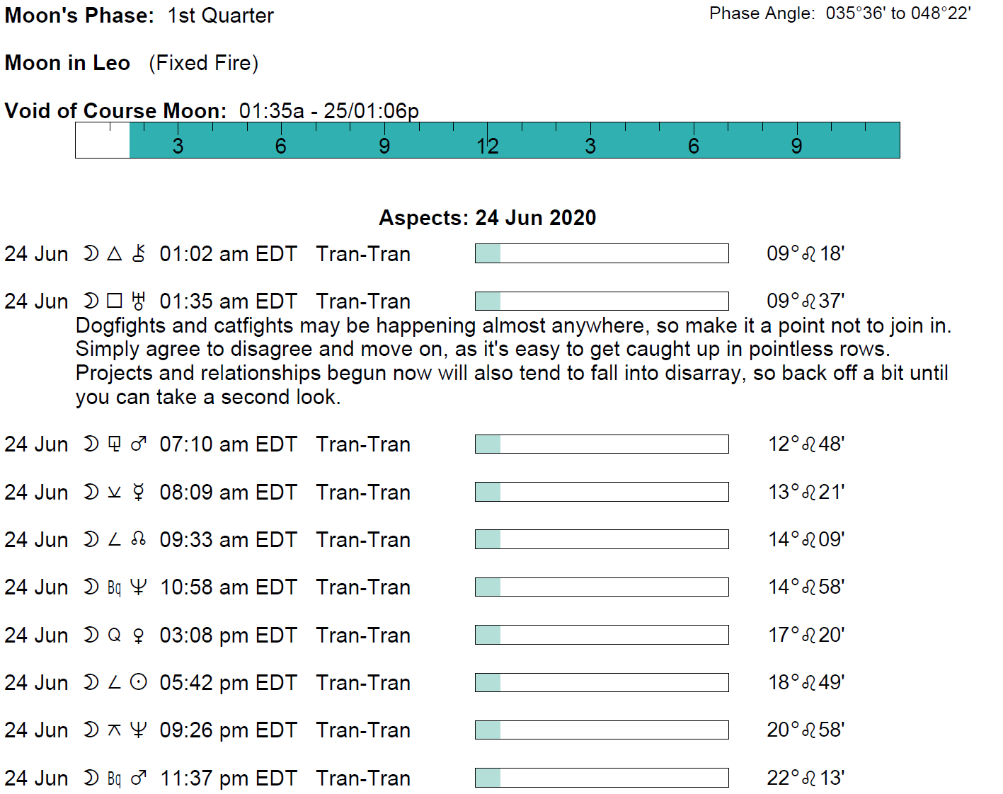 - A void Moon period begins today at 1:34 AM, lasting until tomorrow, June 25th, at 1:04 PM (it’s a longer void period than usual).
