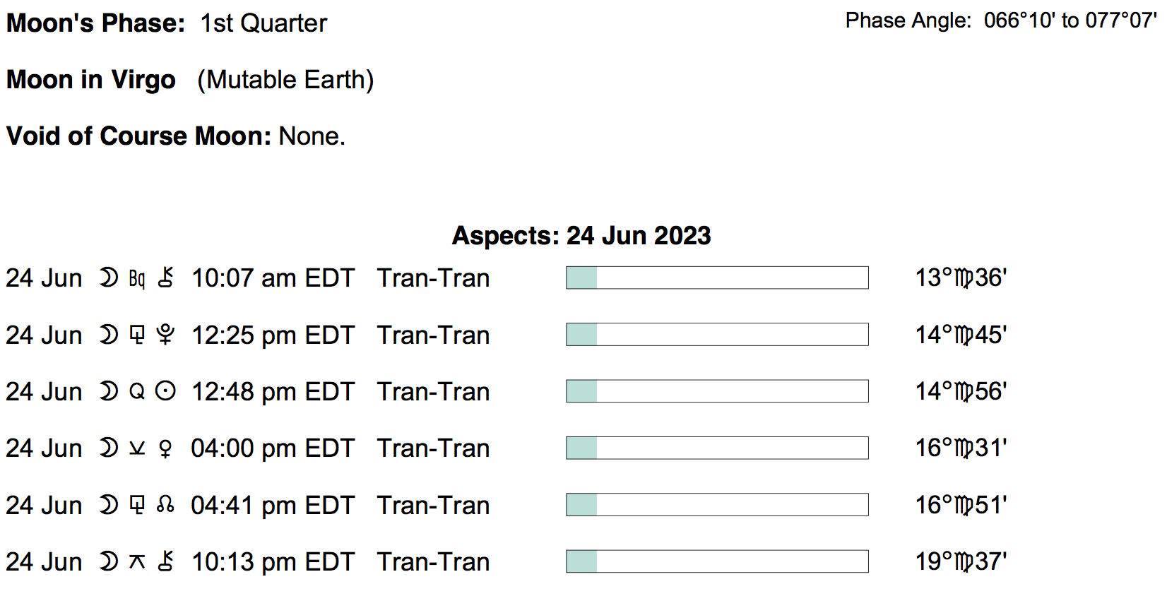 Planet Color Key: The longer the bar, the slower the aspecting planet, and the longer the duration of the planet’s transit.