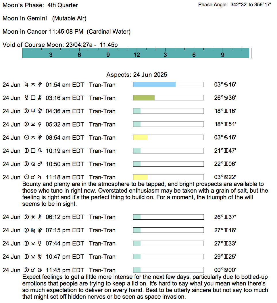 Planet Color Key: The longer the bar, the slower the aspecting planet, and the longer the duration of the planet’s transit.