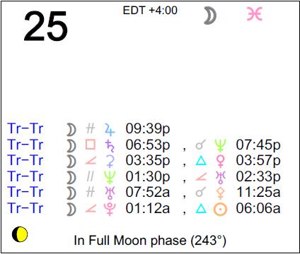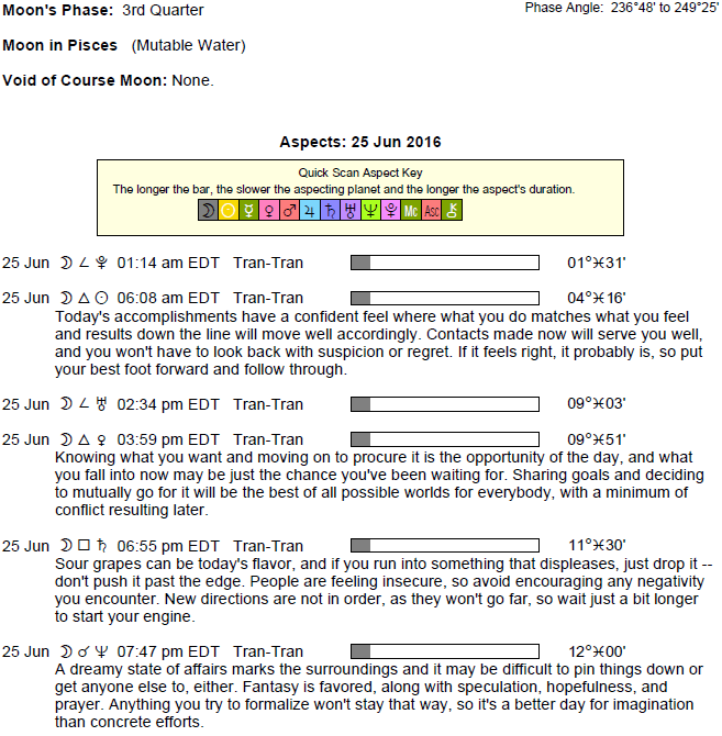 The following aspects (major only) and positions are at noon (EDT) on June 25th: