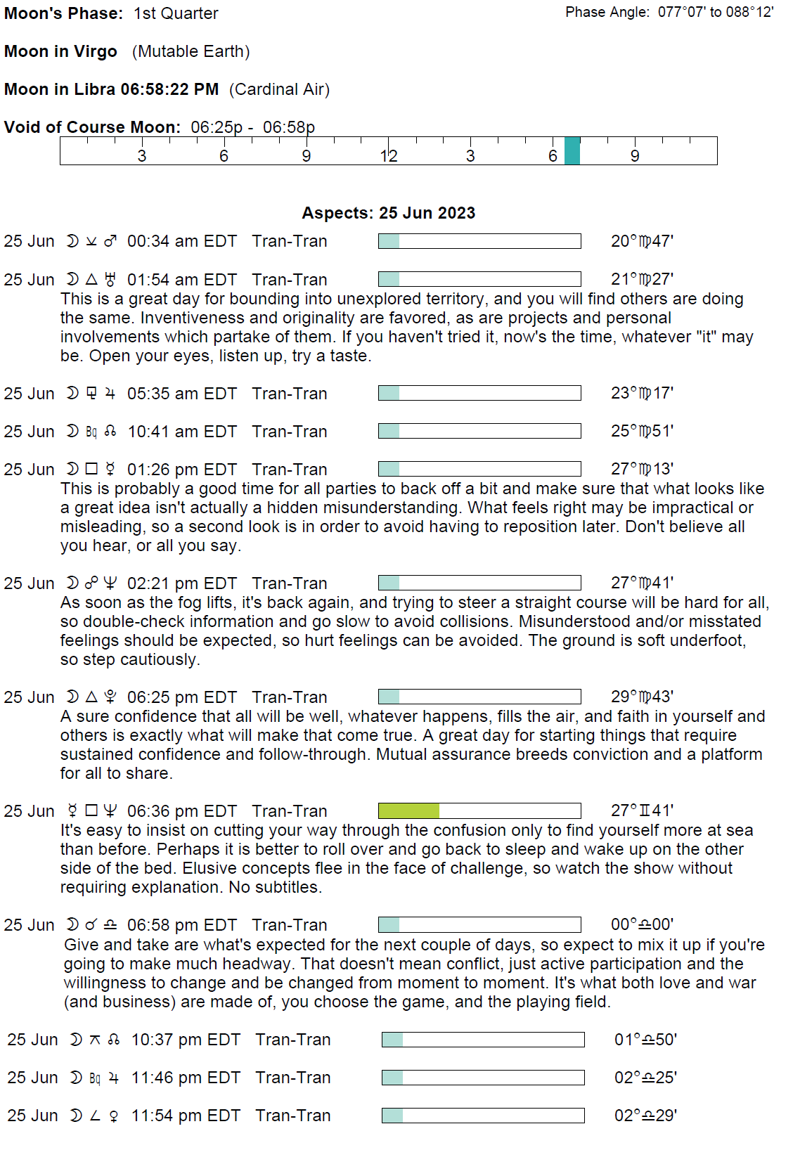 - A void Moon period occurs from 6:24 PM to 6:56 PM today.