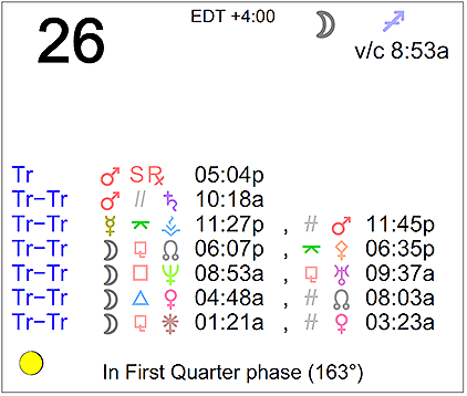 The following aspects (major only) and positions are at noon (EDT) on June 26th: