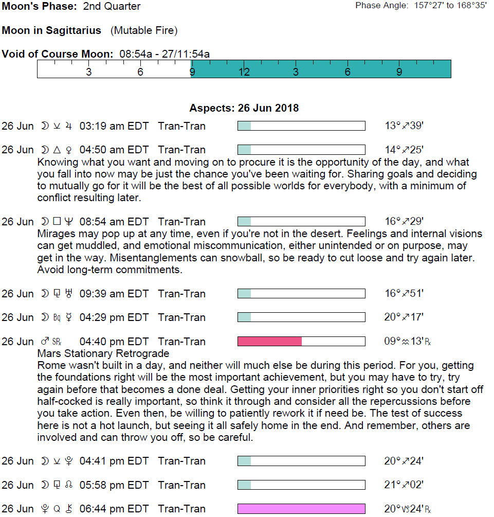 Planet Color Key: The longer the bar, the slower the aspecting planet and the longer the duration of the planet’s transit.