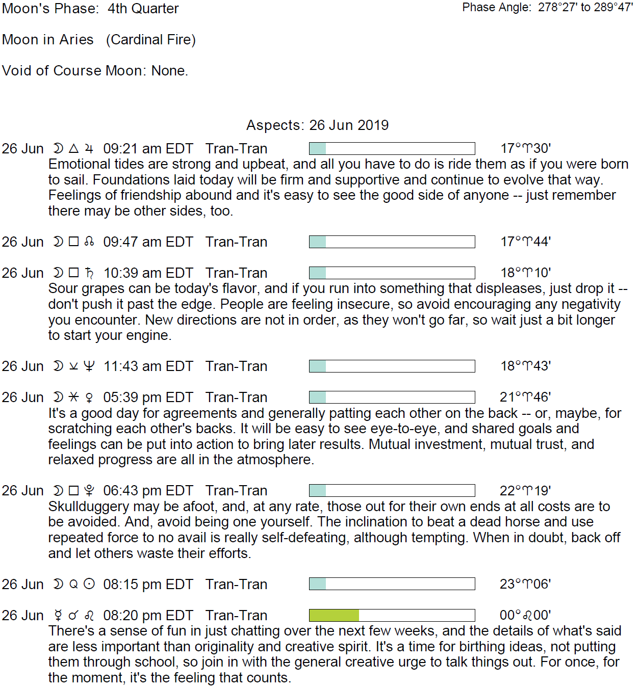 Planet Color Key: The longer the bar, the slower the aspecting planet and the longer the duration of the planet’s transit.