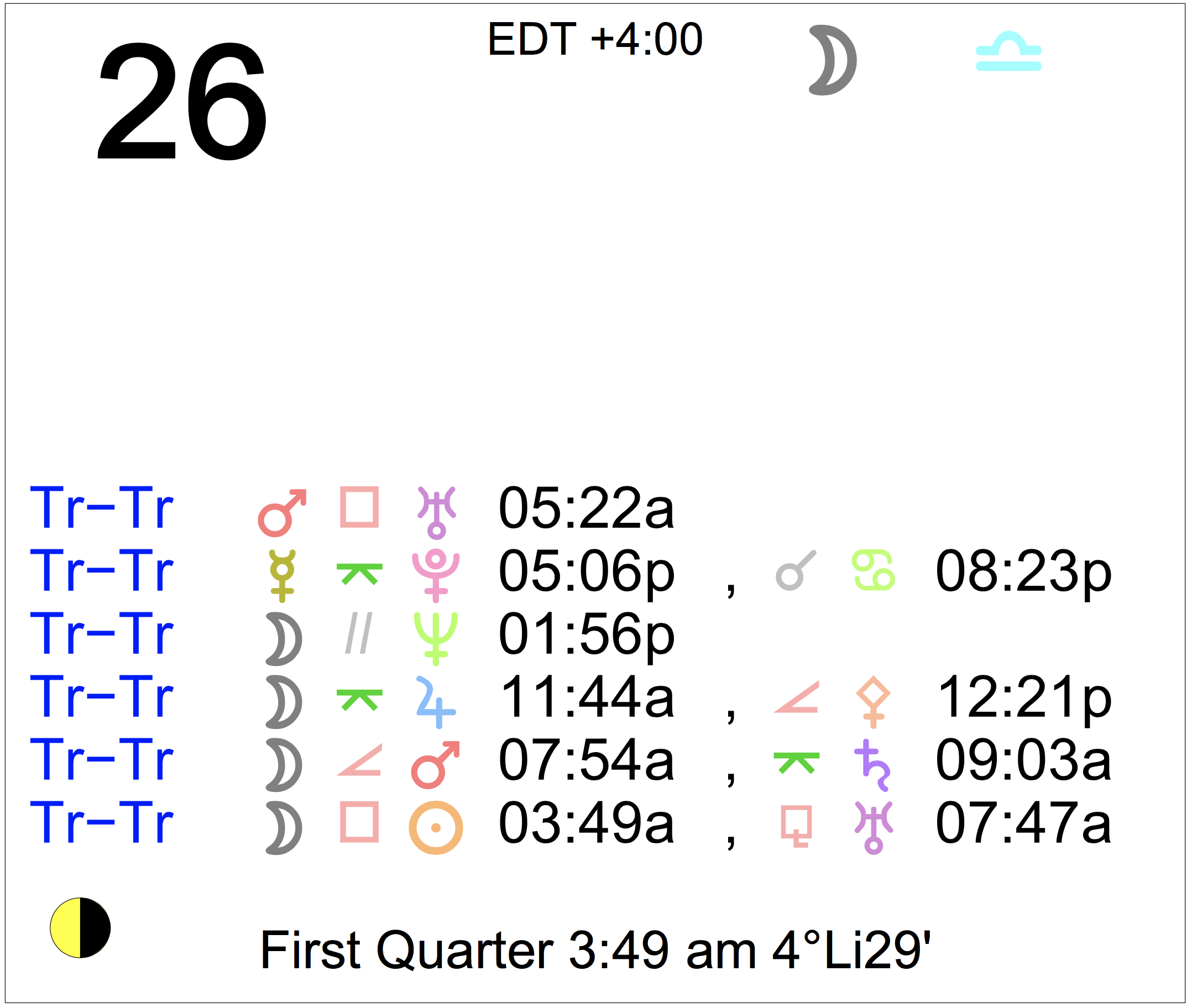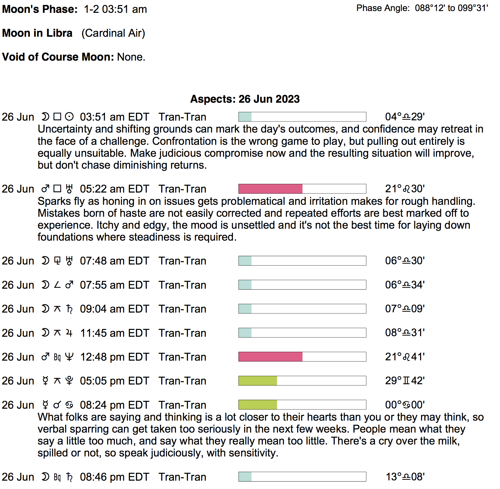 Planet Color Key: The longer the bar, the slower the aspecting planet, and the longer the duration of the planet’s transit.