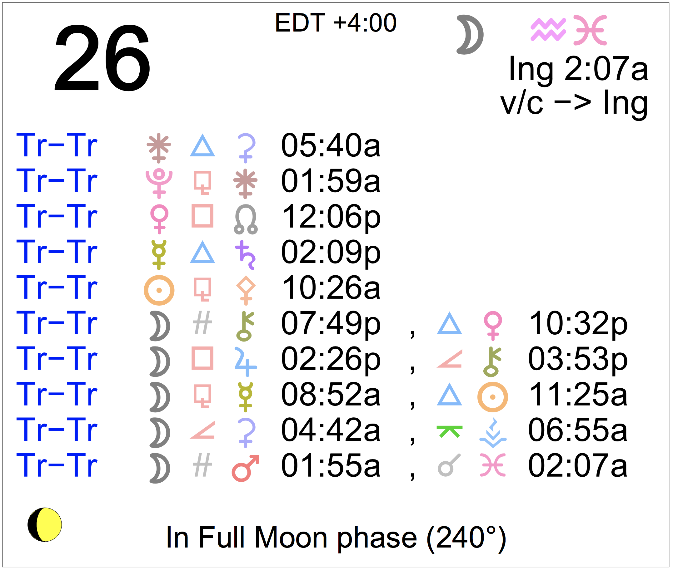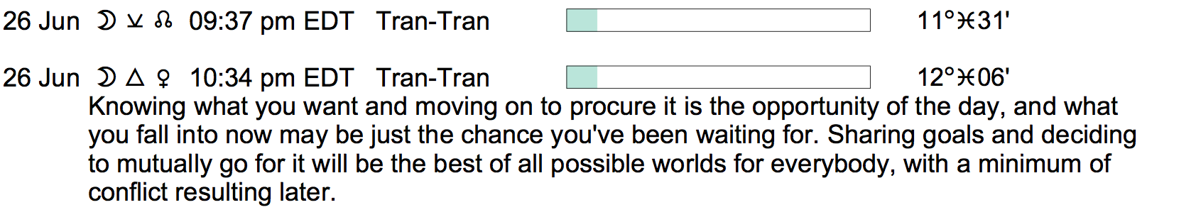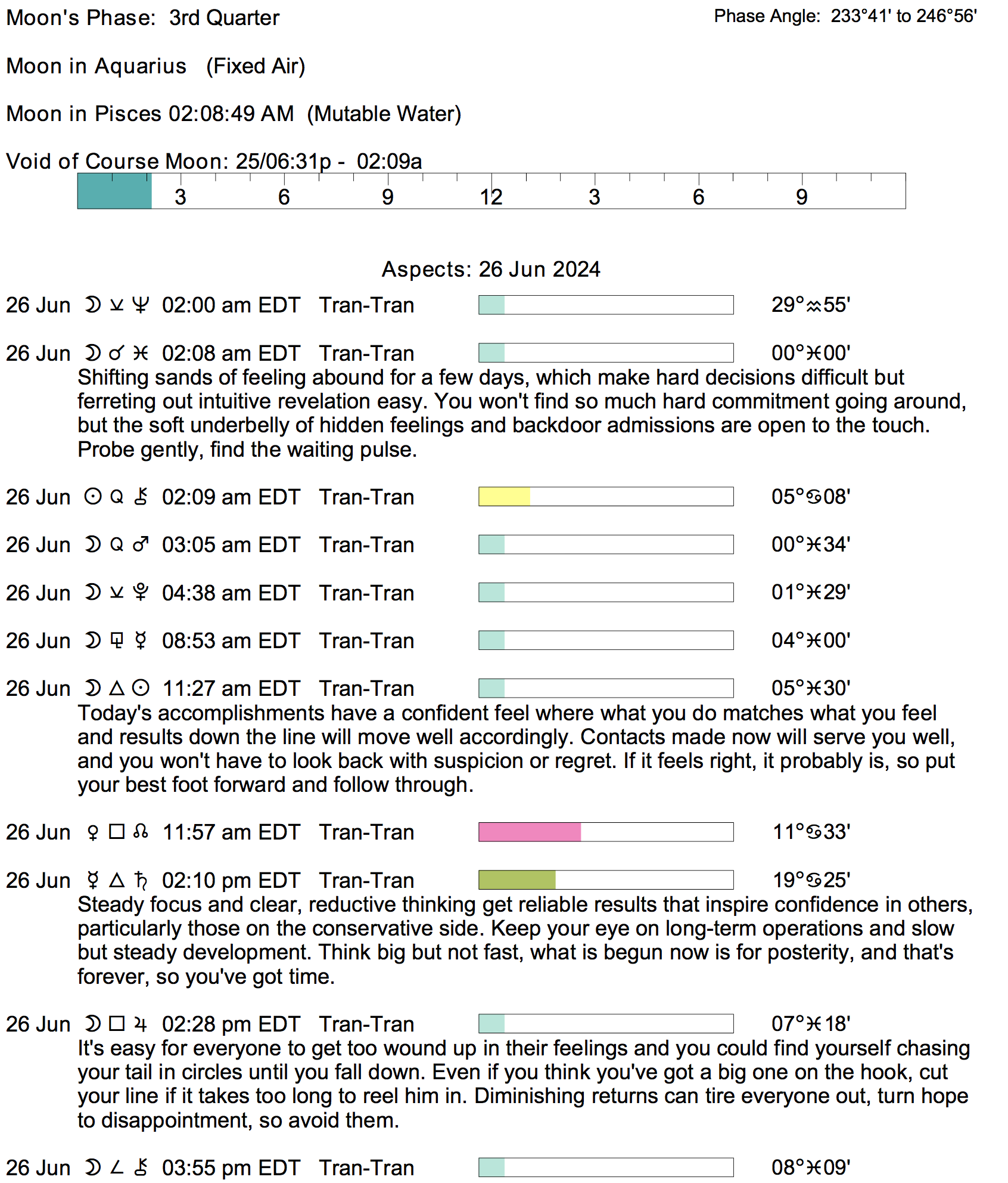 Planet Color Key: The longer the bar, the slower the aspecting planet, and the longer the duration of the planet’s transit.