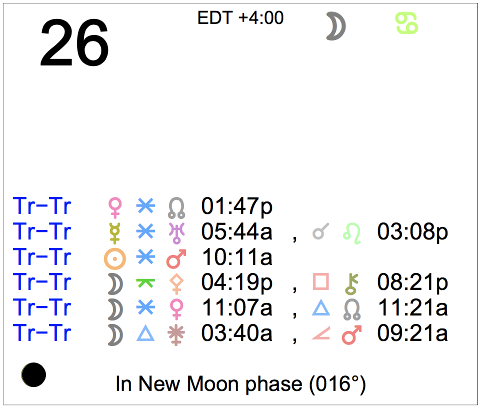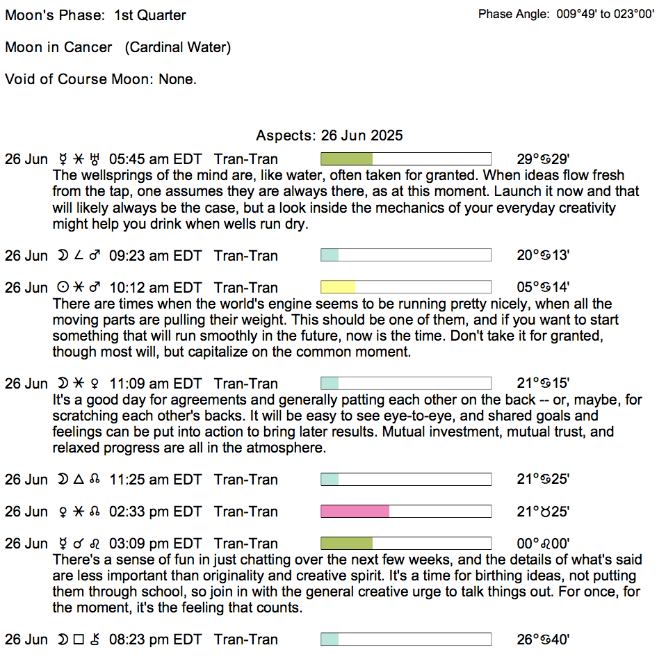Planet Color Key: The longer the bar, the slower the aspecting planet, and the longer the duration of the planet’s transit.