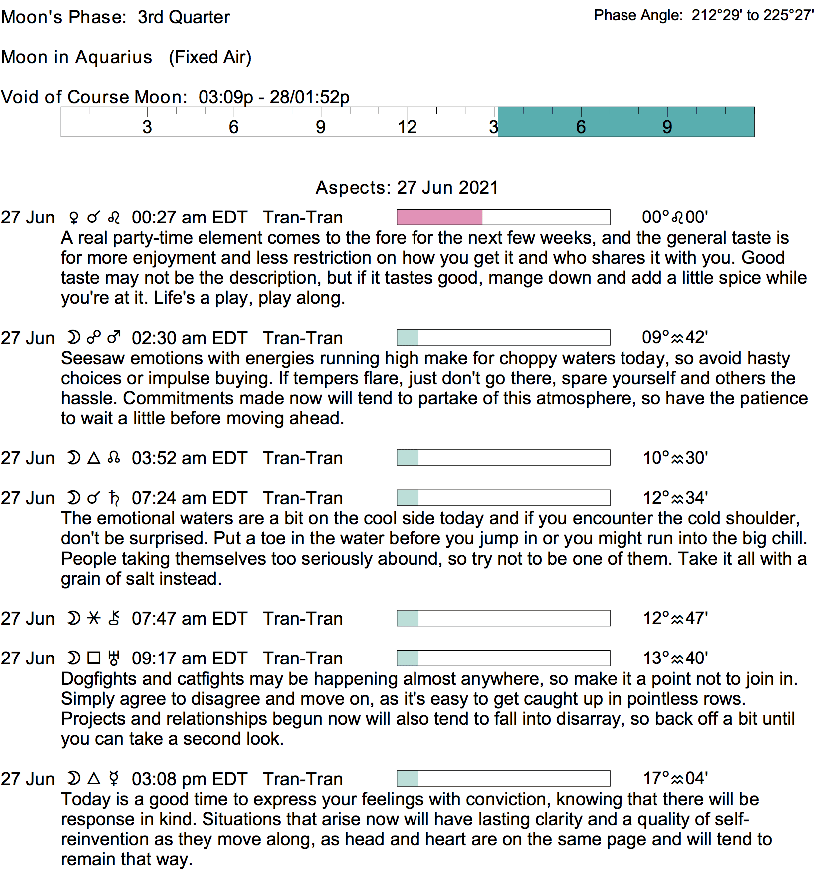 Planet Color Key: The longer the bar, the slower the aspecting planet, and the longer the duration of the planet’s transit.